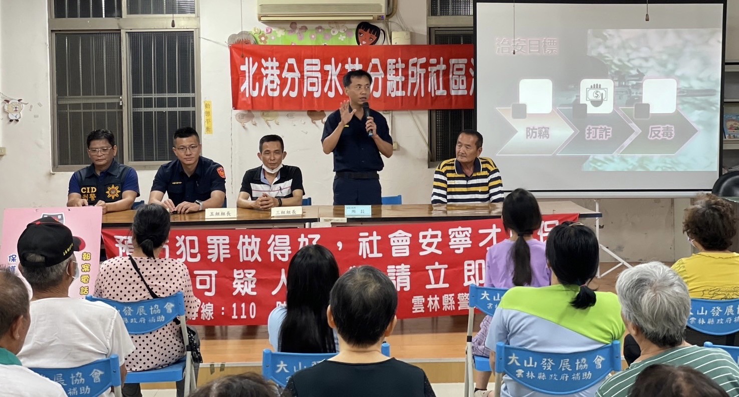 水林聯合所所長楊錦坤先針對轄內治安做重點提醒,隨後由偵查隊小隊長蒲宥橙分析近一年轄內治安狀況,也特別就轄內高發詐欺手法及防範之道、防住宅竊盜及安居緝毒等項目提出報告,另向民眾解說詐欺術包括「假投資」、「假冒公署」、「以檢警機關名義」等態樣,引述真實攔阻案例與村民分享,提醒民眾不管應徵什麼工作,都不要提供存摺給予他人使用。