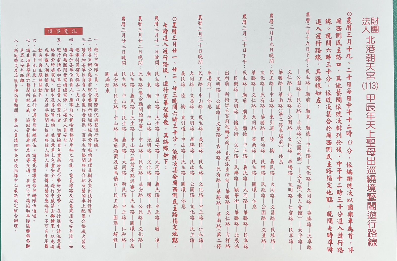 北港警分局分局長張澤銘提醒,自4月27日至5月1日為媽祖誕辰活動最高潮,每天中午12時至晚間22時止,均有神轎遶境及藝閣車隊遊行,由於北港市區街道狹窄,屆時參觀遊街所湧入之人潮、車潮,恐易影響交通秩序及滋生事故,籲請駕駛人及參拜、觀光、旅(香)客能遵循行車秩序,配合交管,或將車輛停放於郊區再步行進入北港市區,以避免車輛陷入遊街車陣中而擔誤時間。