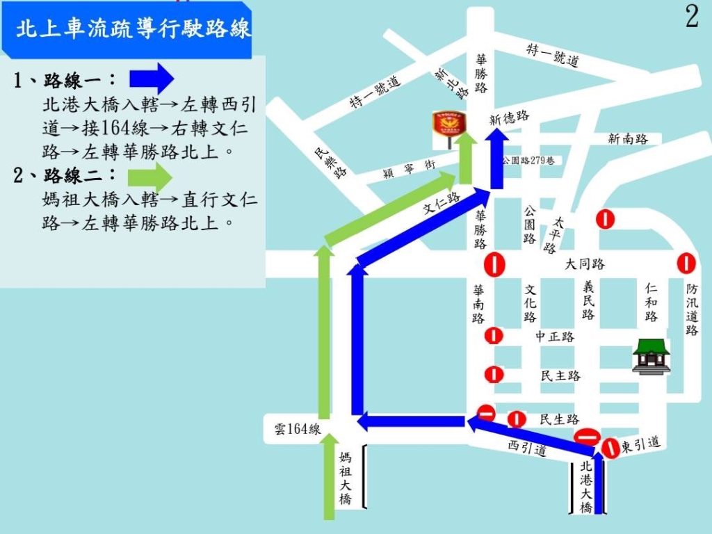 北港警分局指出,因應媽祖遶境第二天(農曆3/20)「北巡新街」,路線往北走,中午在碧水寺停留,下午後則回到傳統的笨港八街遶境。警方因應北港媽祖遶境、藝閣活動交通疏導管制作為如下: