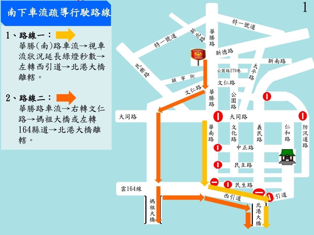 3、華勝路南下車流,引導車輛改道文仁路,經媽祖大橋離轄。【第3截斷點】