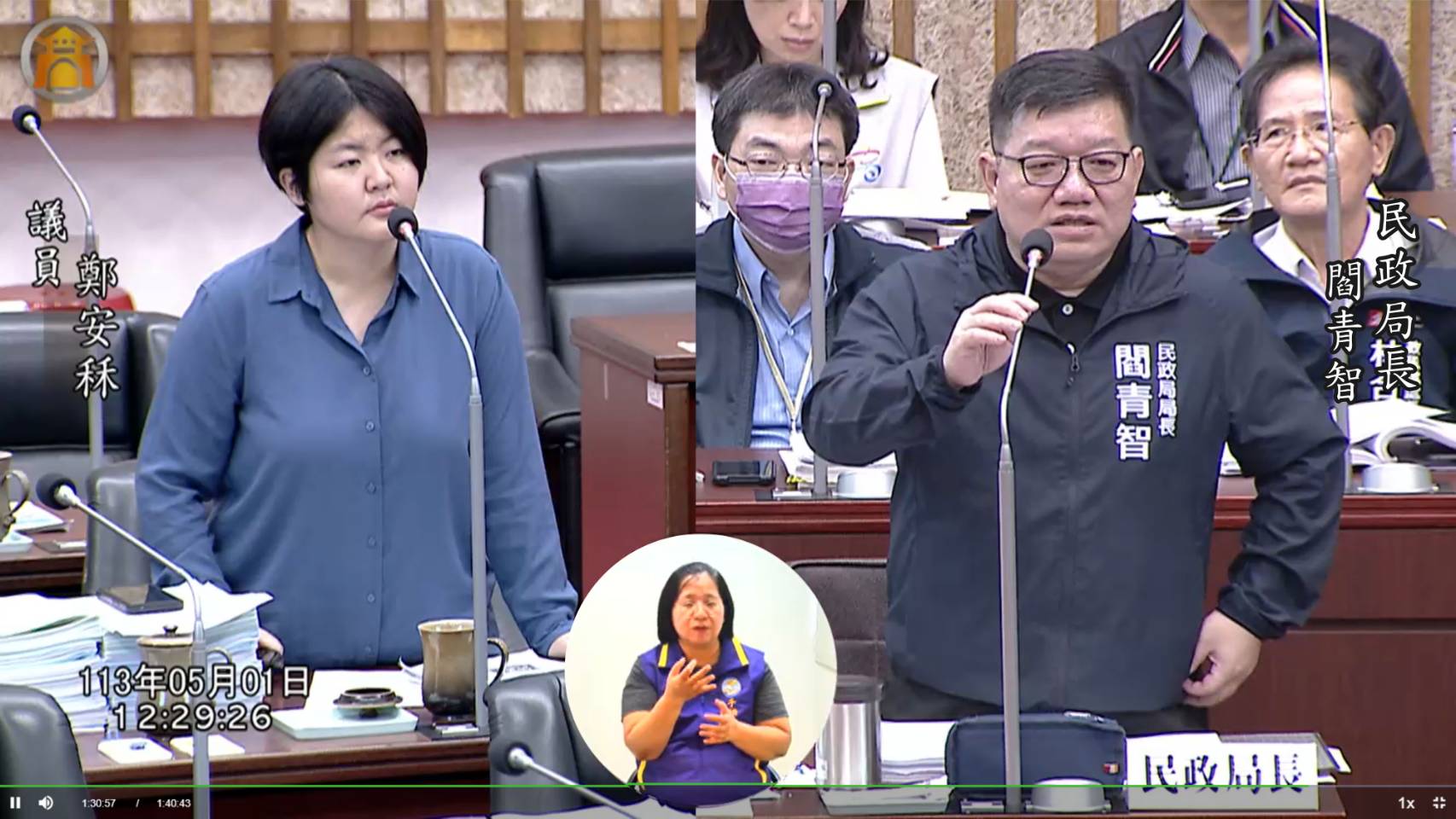 鄭安秝不滿前次會期提案改善鳳山區排水系統的執行情形,因民政局皆回覆俟取得土地無償使用同意書後再行研議改善,但雨季即將來臨,市民不該因市府的行政程序漫長而陷入淹水的險境,嚴厲要求在過渡期要有解決淹水問題的暫行方案。