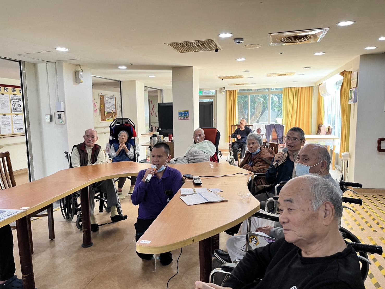 彰化榮家李若蕙護理師表示,每週二下午辦理養護堂卡拉OK歡唱活動,2點一到照服員就準備麥克風及歌本為住民點歌,護理師備好飲料及點心,歡唱卡拉OK就此拉開序幕。麗雲阿姨,雖然不唱歌,但是每次都會來聽,吃著點心,悠然地享受音樂的薰陶。輝生伯伯聽著含淚跳恰恰的音樂就會跟著翩翩起舞、歌聲更是一級棒。而號稱松柏堂歌王的秋北伯伯,總說唱歌會讓他懷念起年輕時候參加歌唱比賽的情景。害羞的忠謀大哥剛開始總是聽大家唱,在不斷鼓勵下跟著照服員唱「愛拚才會贏」,越唱越有信心,現在只要螢幕上出現「愛拚才會贏」時,就知道拿起麥克風唱歌。子聰伯伯唱日文的「再見大阪」,夾雜著中、日文發音,照服員也會跟住民同樂,中間穿插男女對唱來炒熱氣氛,唱著唱著就拉近彼此間的感情。