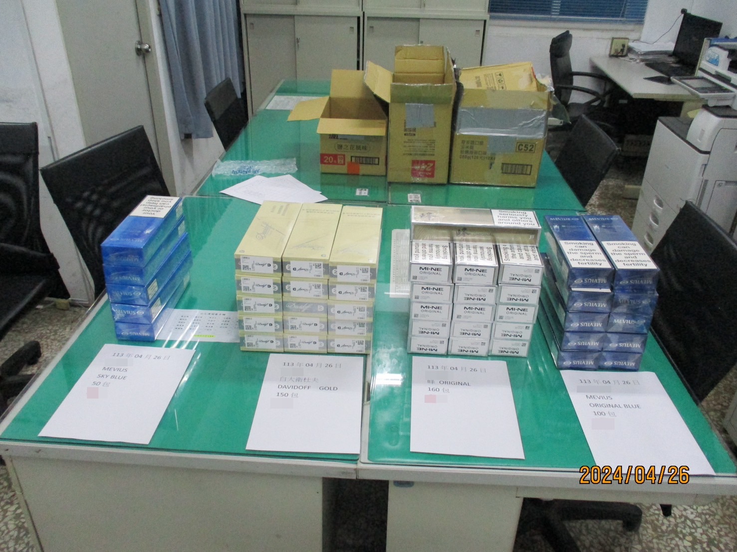 臺中港務警察總隊西碼頭中隊警員吳俊諺上(4)月26日晚間於西碼頭管制站執行守望勤務,18時30分許攔查出港之吳姓男子駕駛之自小客車,在後車廂查獲「白大衛杜夫」、「七星」、「峰」等品牌香菸,共計460包(市值約6萬2,000元)。