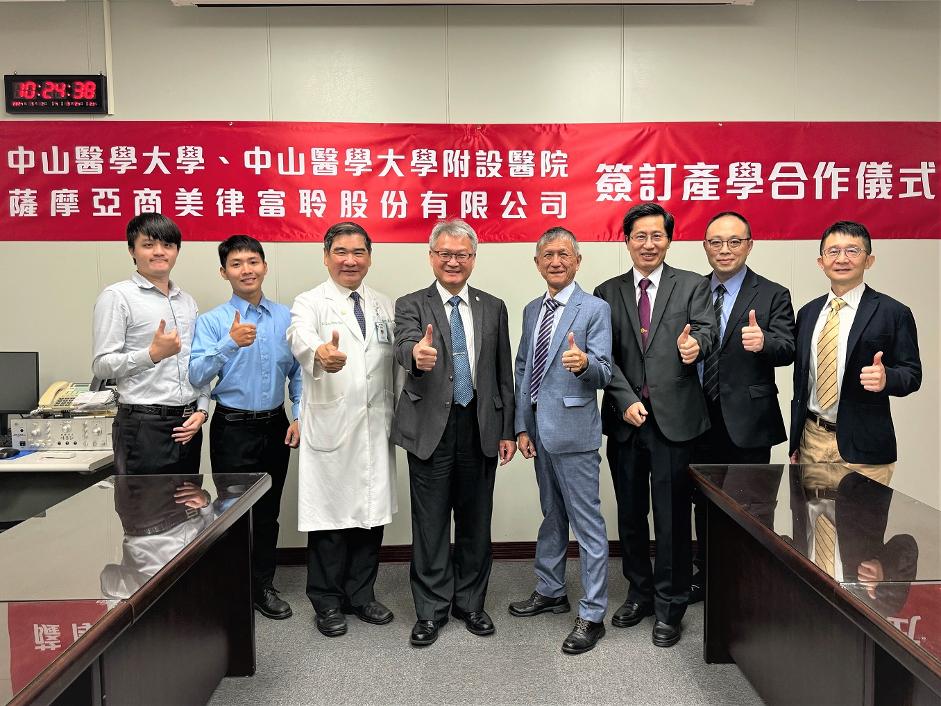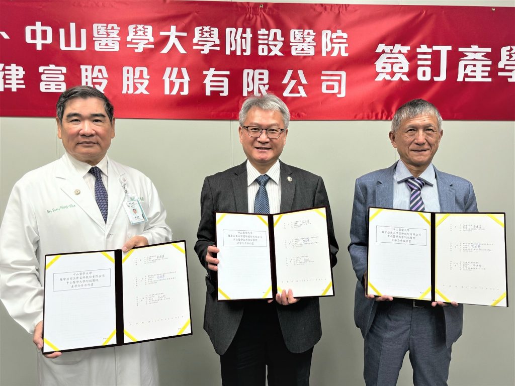 由中山醫大校長黃建寧、中山附醫總院長蔡明哲與薩摩亞商美律富聆股公司台灣分公司總經理謝國靜三方共同簽署的產學合作備忘錄,透過教育、醫療和產業三個不同領域的合作模式,促進醫學教育、臨床實踐和病患服務的緊密結合。出席見證者包括中山醫大醫學科技學院院長余豐益、語言治療與聽力學系主任蔡孟儒、副系主任羅敦信,美律富聆台灣分公司主任廖冠雄和店長暨聽力師張軒瀚等人。
