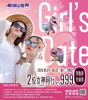 已進入五月母親女神月,今(2024)年劍湖山世界推出「五月假日限定,Girl’s Date」,5/1至6/2週六日限定,「女神」優惠專案,兩位女神出遊,門票享對折優惠,兩人同行只要999元。現場每人加價1000元,可升級為夏季享玩卡,從購票日起,無限暢玩到9/1。