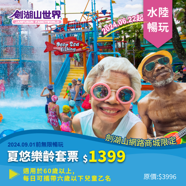 而劍湖山網路商城於2024/5/3起,也限量推出阿公阿媽帶孫同樂的夏季享玩卡「夏悠樂齡套票」,適用於60歲以上的朋友,每張套票只要1399元,從購票日至2024/9/1,都可以天天帶著一名106年7月1日以後出生之兒童一起暢玩劍湖山,更多優惠內容,詳洽劍湖山網路商城https://www.janfusun.com.tw/fancygo.php