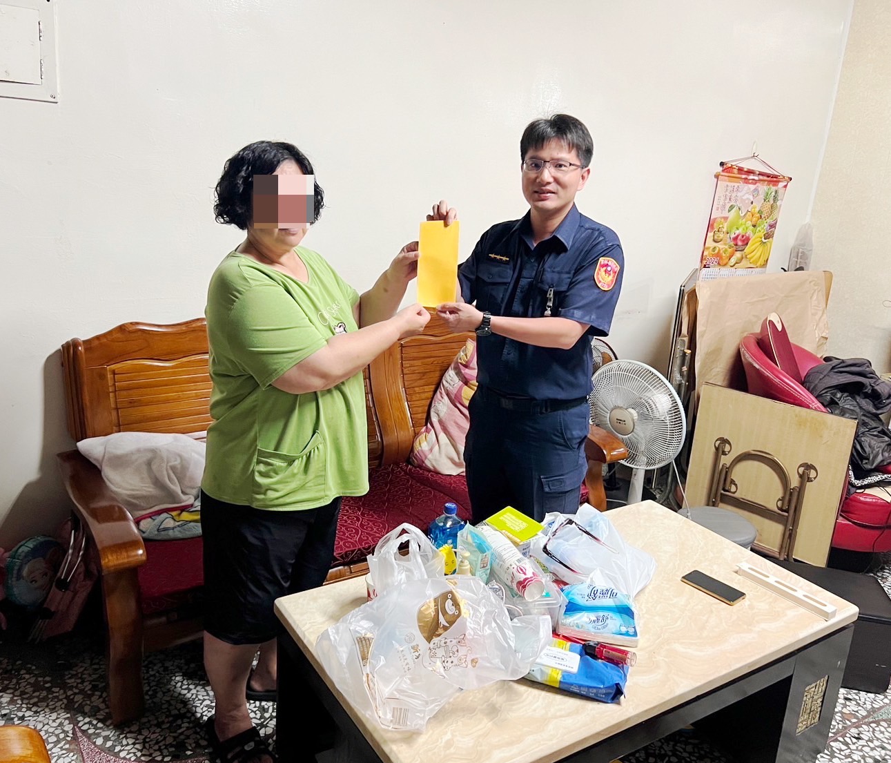 母親節前夕,警員陳舜宜家戶訪查發現口湖鄉陳姓婦人照顧中風併發阿茲海默症多年的老母親,生活僅靠打零工苦撐,下崙派出所副所長蔡瑞彬透過張榮發基金會暖心伸援,帶來新臺幣1萬5千元及民生物資1批,也協助申請馬上關懷救濟金,希望社會愛心人士能夠幫助該家庭走過困境。