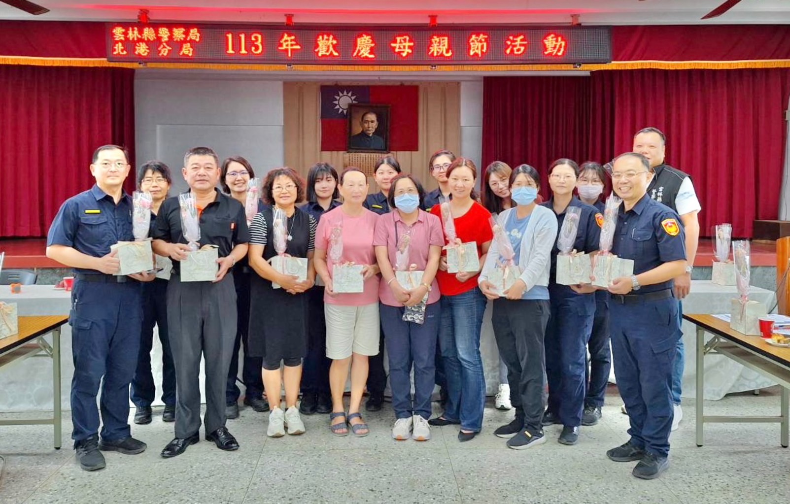 溫馨母親節將至,為感謝所有職場媽媽無私的付出,北港警分局今(8)日下午特別舉辦「分局長有約-溫馨茶會」,由分局長張澤銘偕同警友會北港辦事處主任謝政峯、顧問團團長謝中憲致贈「永生花」及媽媽們最愛的「香氛禮盒」予分局30多位辛苦的女性同仁,表達由衷的祝福與敬意,也提醒男性同仁回家給媽媽一個大大的擁抱,感謝偉大媽媽為家庭的付出。