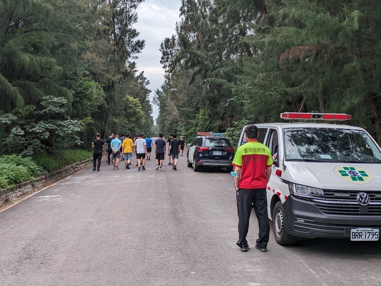 另為避免同仁於測驗競賽中因體能速度調配不當造成意外事故,協調童綜合醫院派醫護人員攜相關器材(設備)及救護車到場待命,並於施測前由常訓教官叮嚀同仁,隨時關注自身狀況,稍有不適立即暫停,安全第一。