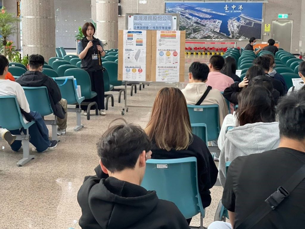 臺中港務分公司知道能讓員工具有幸福感、歸屬感的企業,才是新鮮人的首選,近年內積極參與中部校園徵才就業博覽會,並在各大專院校學生來港區參訪時舉辦企業說明會暨性別平等宣導,同時推廣性別平等理念,積極強化公司在消除職場性別歧視的推動。想讓新鮮人知道公司在幸福企業的積極作為及推動,歡迎有志於加入港務大家庭的求職者,深入了解我們公司文化和工作機會,與我們一起共創未來,在港務大家庭實現職業理想。