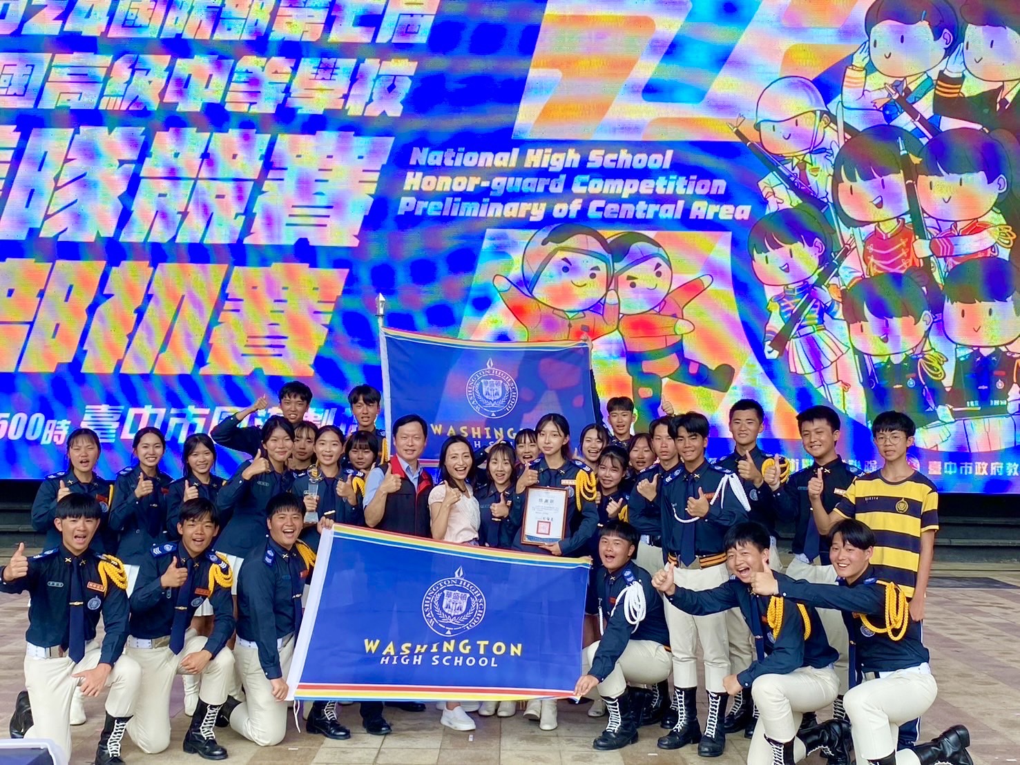 臺中市華盛頓高中群蜂儀隊參加2024國防部第七屆全國高級中等學校儀隊競賽,榮獲中部初賽第一名,晉級全國儀隊比賽,展現「紀律、態度、禮貌」的核心價值,發揮最好的一面,在競賽中脫穎而出。