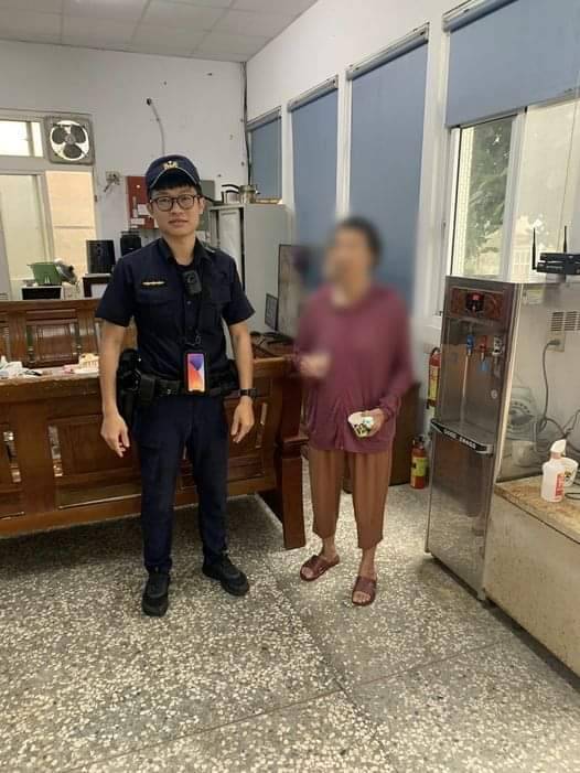 員警見她全身淋濕,立即載她回所內休息,端上熱茶給老婦人祛寒,閒聊中察覺她的記憶仍停留在少女時期,立即查證身分通知家屬前來接回,家屬看到老婦人安然無恙的在警所內休息向員警表示:「她趁著家人不注意騎車出門,等到我們找不到人才知道嚴重了,還好警察幫忙,真的很感謝。」