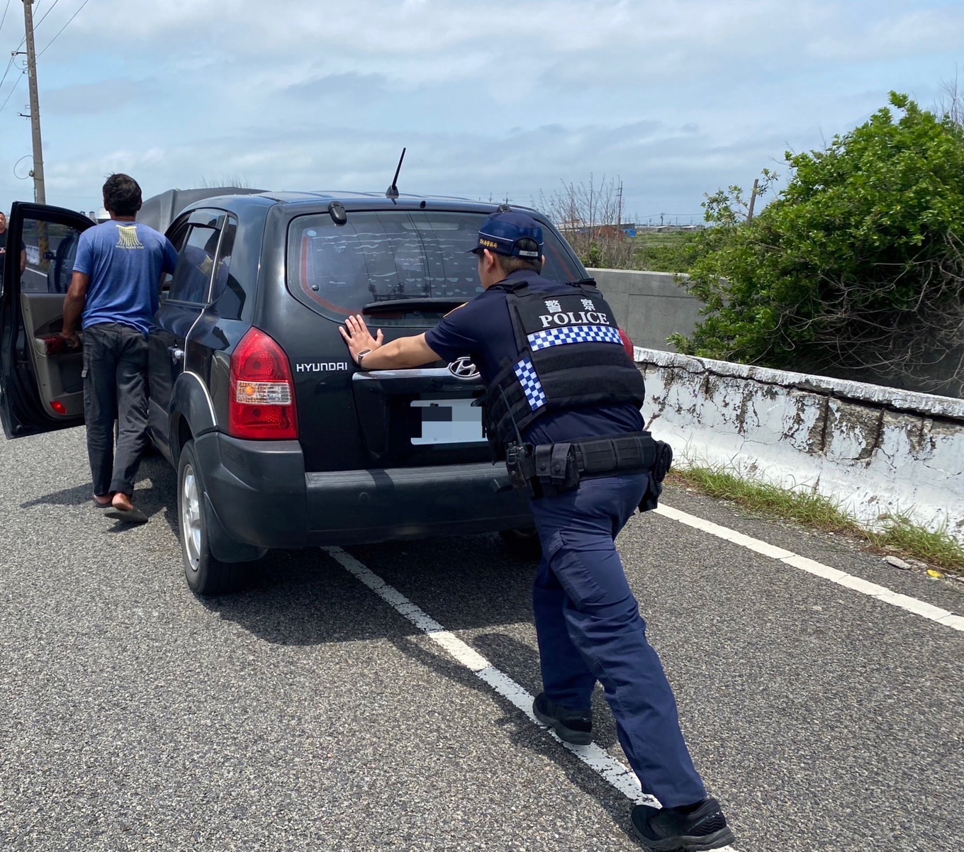 口湖聯合所警員陳舜宜、吳東洋13日於轄內巡邏,巡經口湖鄉雲164線金湖段時,發現一部黑色自小客車在快車道上靜止不動,車輛閃爍著危險警示燈。2名員警立即反應處理,上前關心駕駛人員發生什麼狀況。