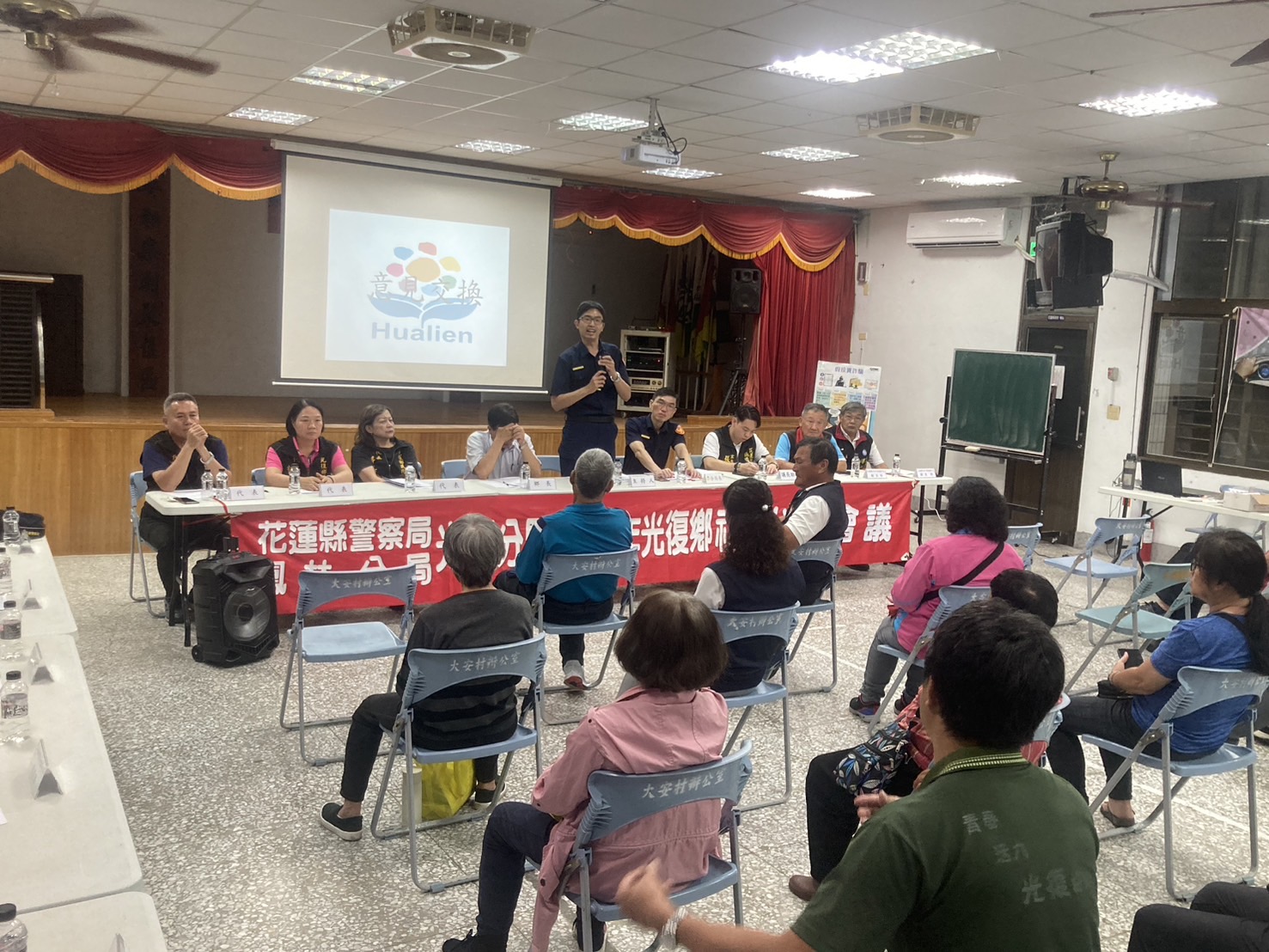 鳳林分局光復分駐所23日19時在光復鄉大安活動中心舉辦治安座談會,現場有各級民意代表、鄉村里鄰長、地方協勤民力及光復鄉親一同共同參與,同時結合宣導反詐騙及修法後的交通用路觀念讓民眾知悉相關資訊,希望藉由此次活動,遏止犯罪發生共創美好家園。
