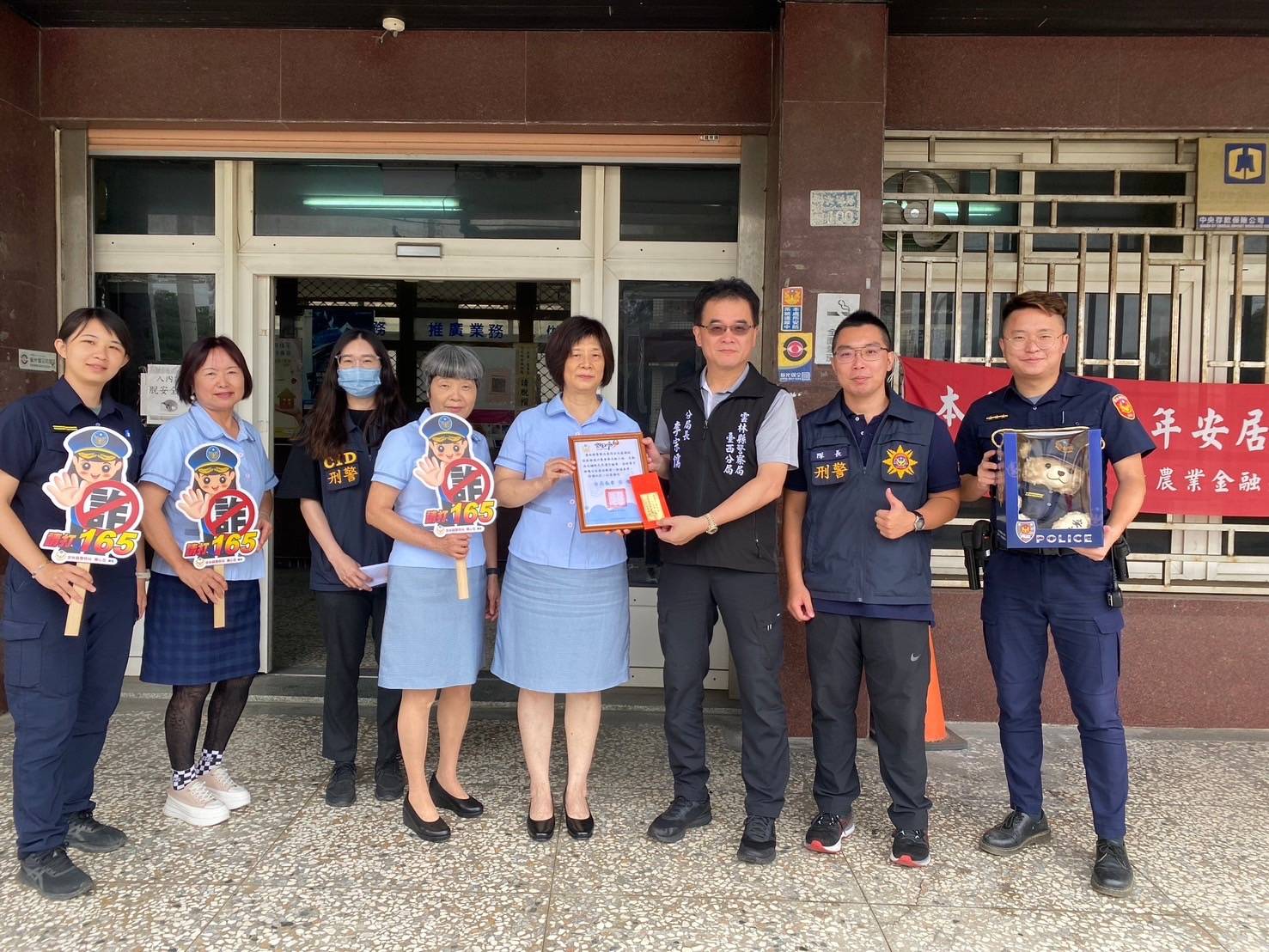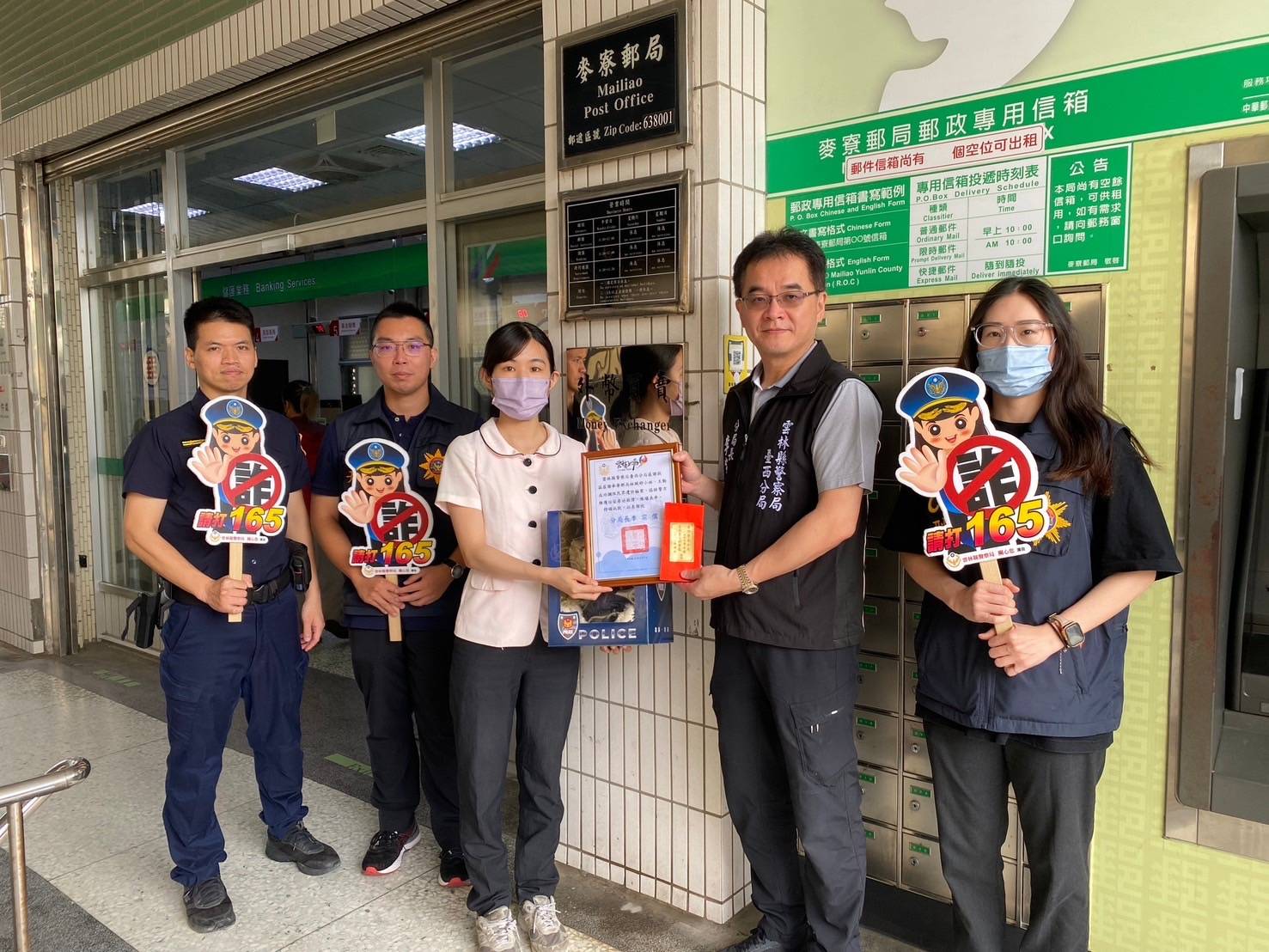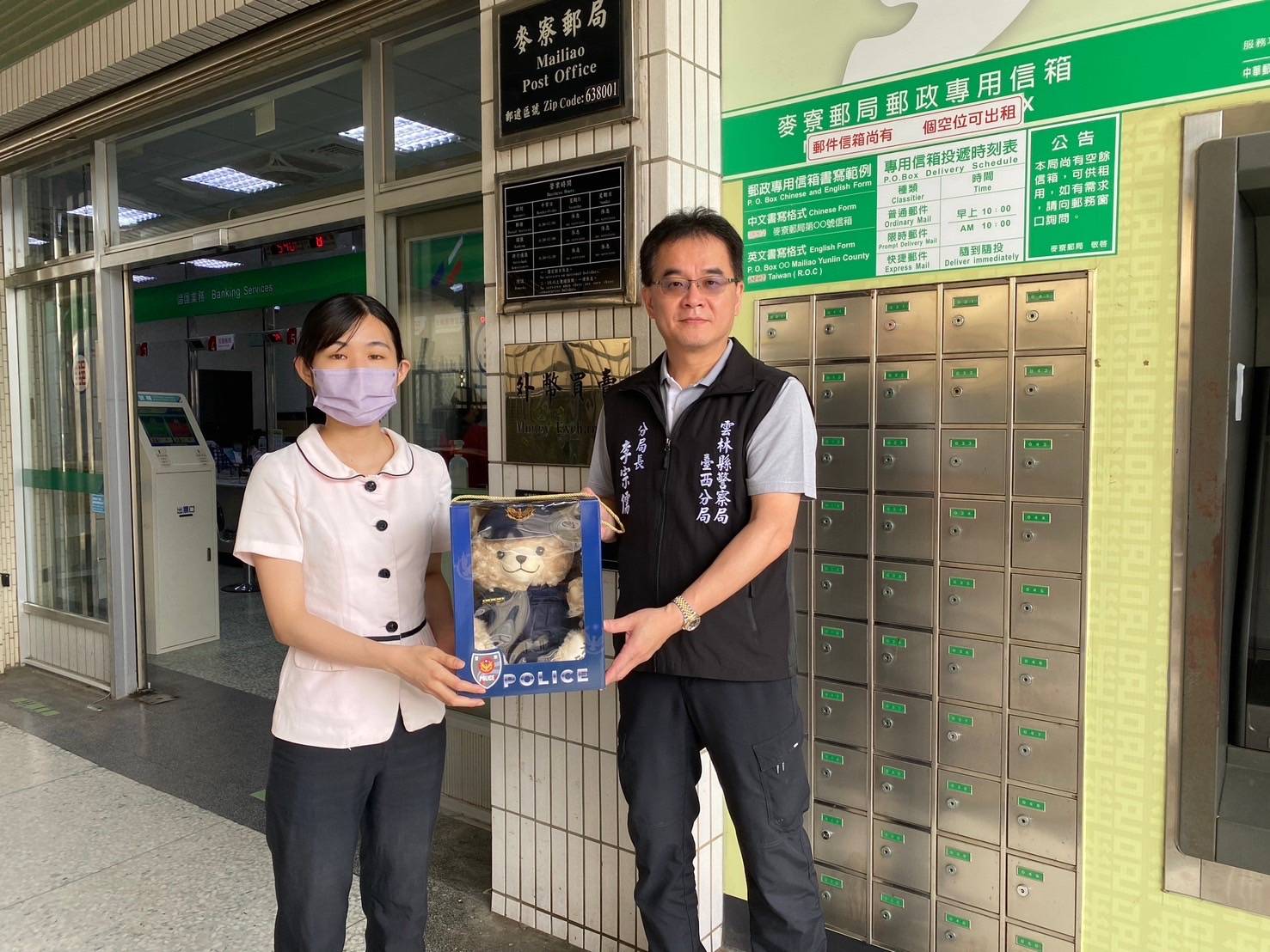 邇來詐騙手法層出不窮,雲林縣警察局為了守護民眾財產,啟動「金融機構及超商攔阻詐騙工作強化作為」計畫,結合轄內金融機構「關懷提問」機制,透過警方與行員合作阻止詐騙,雲林縣警察局臺西分局為感謝行員機警發現並通報警方攔阻,特於日前上午10時許率同分局防詐宣講團拜訪轄內金融機構,並頒發紀念品「分局長熊」,以表達感謝。