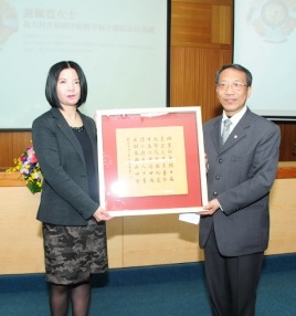 圖說:靜宜大學校長唐傳義(右)與台北市文化局長謝佩霓(左)一起展示騎士勳位證書。(記者楊川欽攝)