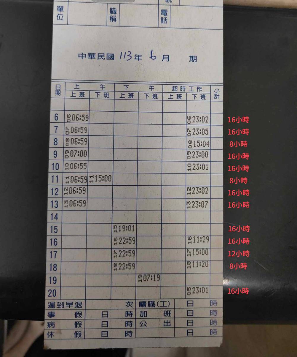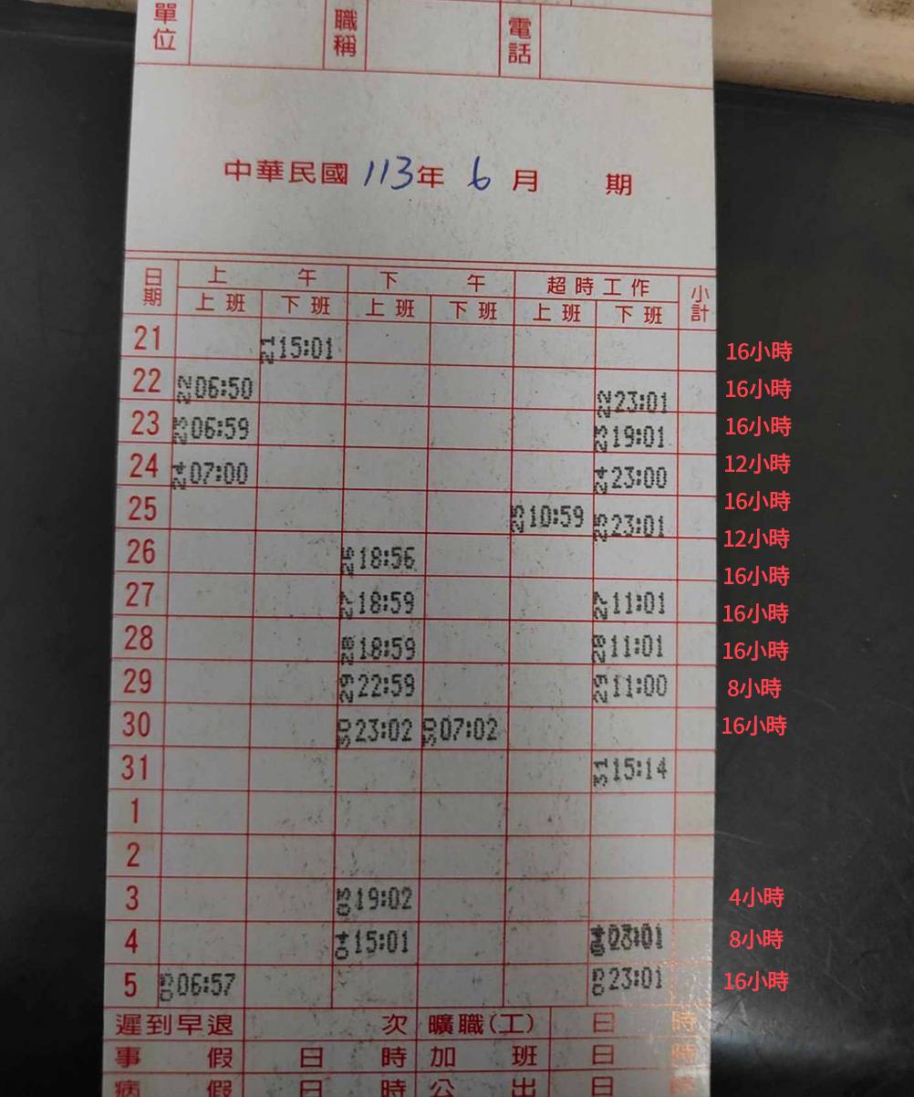 圖:上下班計時卡半個月已超過法定一個月的加班時數(投訴者提供)