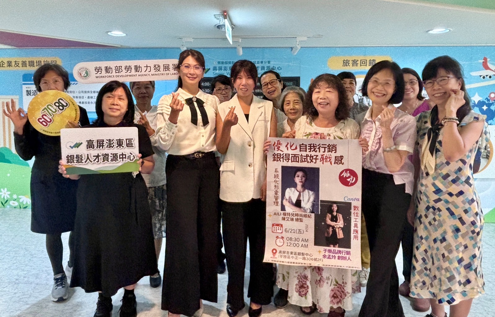 「有本事,更要會行銷!」在現今就業市場環境,「形象管理」和「個人職場品牌美學」已畫上等號,而成功的「自我行銷」不僅有利於求職,更能提高錄取率,如何用第一印象擄獲面試官芳心,也是壯世代重返職場最重要的課題之一。勞動部勞動力發展署高屏澎東分署高屏澎東區銀髮人才資源中心於今(21)日辦理【銀力增能工作坊】活動,邀請具豐富形象管理經驗的經紀總監及品牌行銷公司創辦人擔任講師,帶領銀髮學員提升個人表達能力與美學感知,並運用數位工具產出具個人特色的履歷表,可以說是從內到外增加就業競爭力,讓銀髮哥姊們在面試時拔得頭籌,更有信心開啟第二職涯。