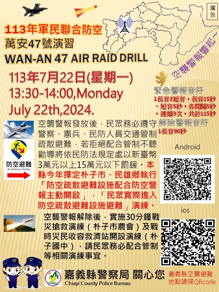 113年中部地區軍民聯合防空 (萬安47號)演習,訂於7月22日(星期一)下午1時30分至2時,實施30分鐘防情傳遞與警報發放、疏散避難、交通及其他必要管制等實作演練。