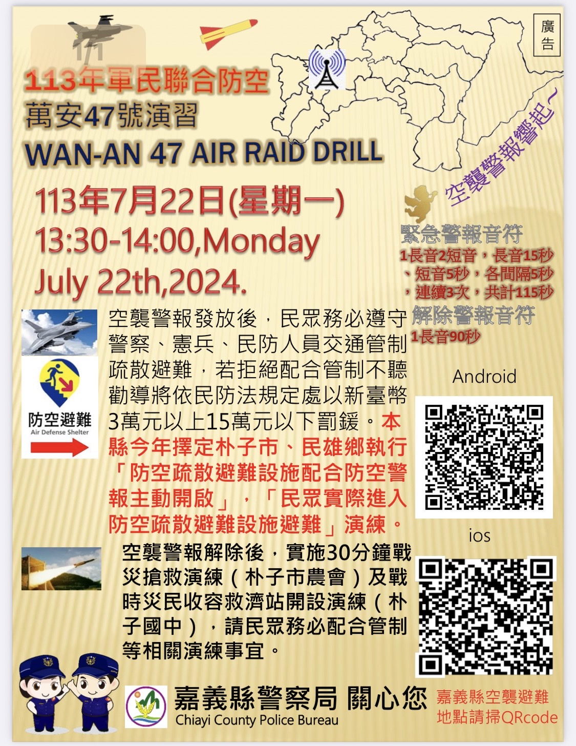 113年中部地區軍民聯合防空(萬安47號)演習將於7月22日下午1時30分至2時,在儘量不影響民眾生活作息原則下,採有預警方式,實施30分鐘警報傳遞與發放、疏散避難、交通及其他必要管制等實作演練。
