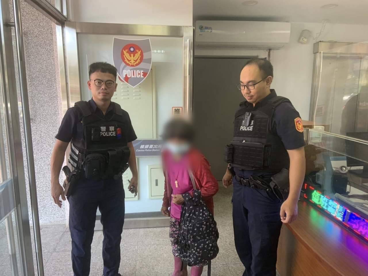 警員廖峻誠、詹金昇火速趕往現場,發現高齡的婦人全身是汗、臉色蒼白,立即扶她至一旁休息,老婦人告訴員警:「我要去地政事務所辦事情,我走了很久,可能是天氣太熱了才會沒體力,休息一下就好了。」警方載老婦人至所內安置,端上飲用水讓她解渴,拿來乾糧讓她補充體力,短暫休息後老婦人漸漸恢復體力,。