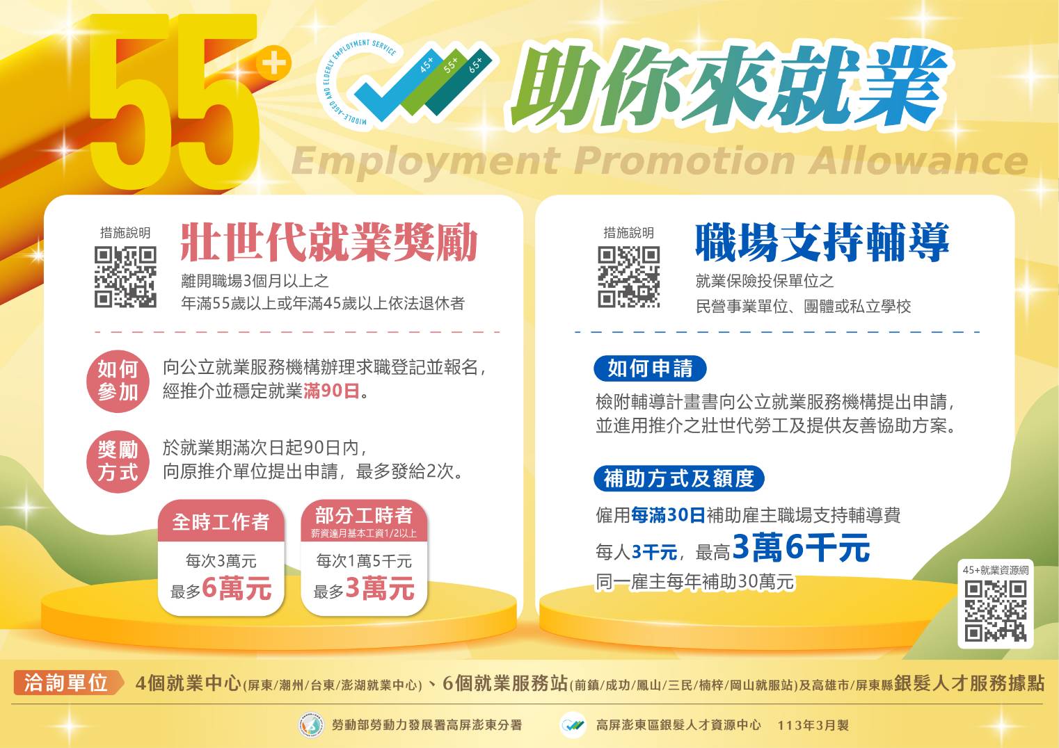 面對人口高齡化及產業缺工的雙重挑戰下,企業開始重視中高齡及高齡人才的僱用。勞動部「僱用獎助措施」鼓勵企業廣納壯世代族群,以彌補人力缺口,企業以正職僱用65歲以上民眾,每月可獲最高1萬5,000元的獎助津貼,最長可補助1年!勞動部高屏澎東分署高屏澎東區銀髮人才資源中心,積極輔導企業建立友善職場,善用獎助措施開發高齡友善職缺,113年已成功媒合10多位65歲以上高齡銀髮民眾重返職場。
