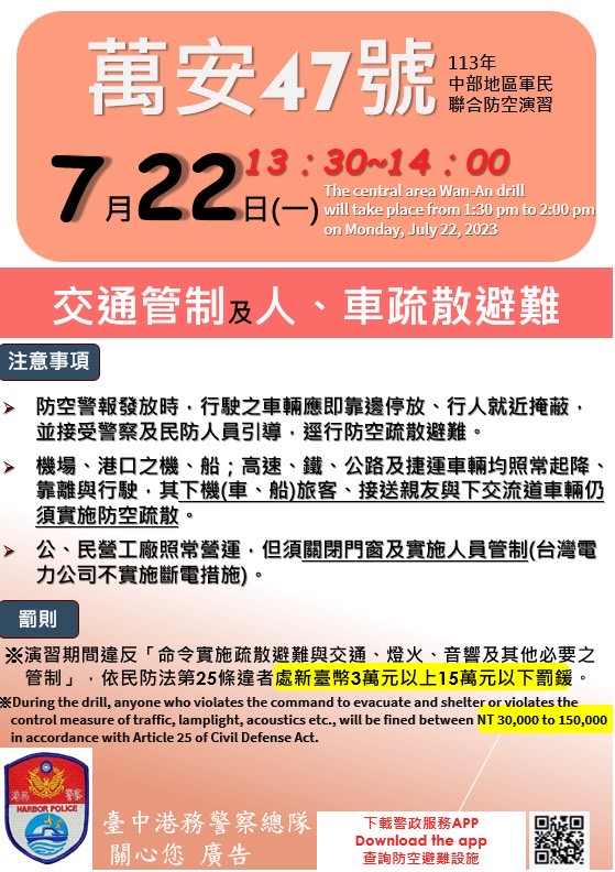 為提升全民防空避難應變能力,113年萬安47號演習將於7月22日13:30至14:00舉行。臺中港結合此次演習,於港區內23處防空避難室,提供民眾避難演習。