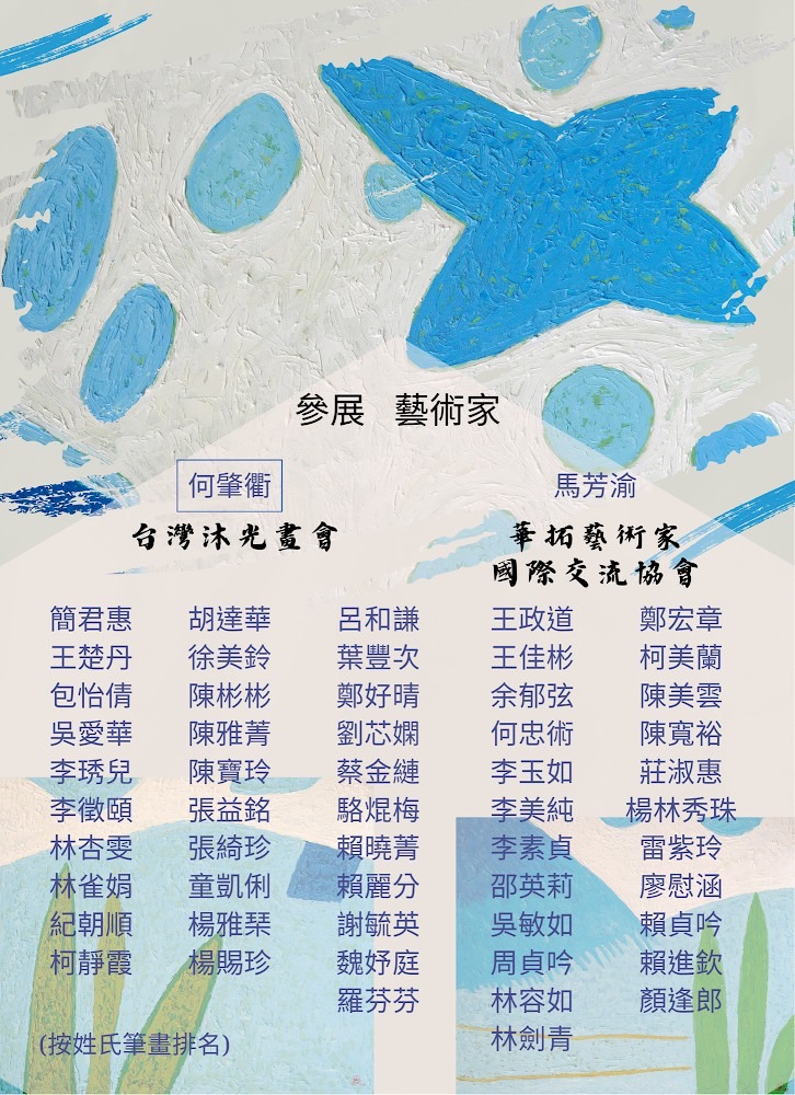 台灣沐光畫會源於2015年台中,致力於推廣台灣當代藝術,為本地藝術家提供展示平台,並促進國際藝術交流。沐光畫會的成員懷抱初心,以勇敢和力量從內心出發,透過豐富多變的作品展現不同面向的藝術世界,既奔放又內斂。華拓藝術家國際交流協會於2019年在臺南成立,秉持著「透過藝術創作形塑人與人之間橋樑」的精神,致力於擴增台灣藝術市場,並促進多元新興藝術的交流空間。此次二個畫會攜手,期待相互激盪、增添更多藝術養份。
