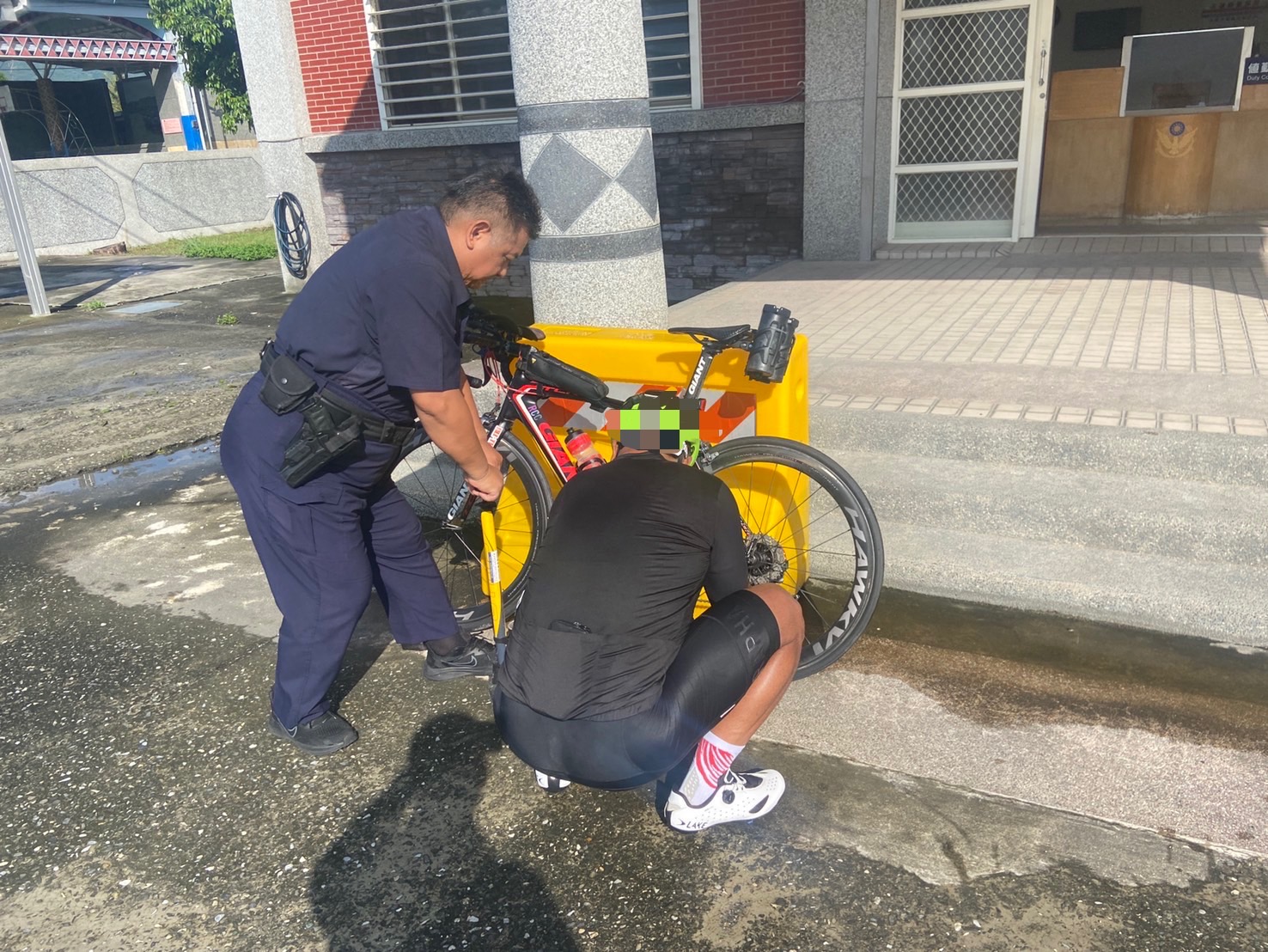 花蓮縣警察局玉里分局崙天派出所長余明和,日前擔服值班勤務,於門首瞭望時發現一名男子牽著自行車在花75縣道徘徊,由於正值上班尖峰期間,所長便上前關心,同時請其進來派出所內稍作休憩;經瞭解江民表示,當日從臺東市區騎乘自行車預計要前往玉里鎮上,沿途行經卓溪鄉崙天部落,發現這邊的風景名勝,彷彿來到世外桃源,惟輪胎卻在長遠的路途中不幸爆胎,江男雖有準備簡易補胎工具,並於現場簡單修復,想不到輪胎盡然再度洩氣,所幸所長立即以打氣筒協助江男打氣,解決此次的窘境,江男對所長的熱心幫助,深表感激。