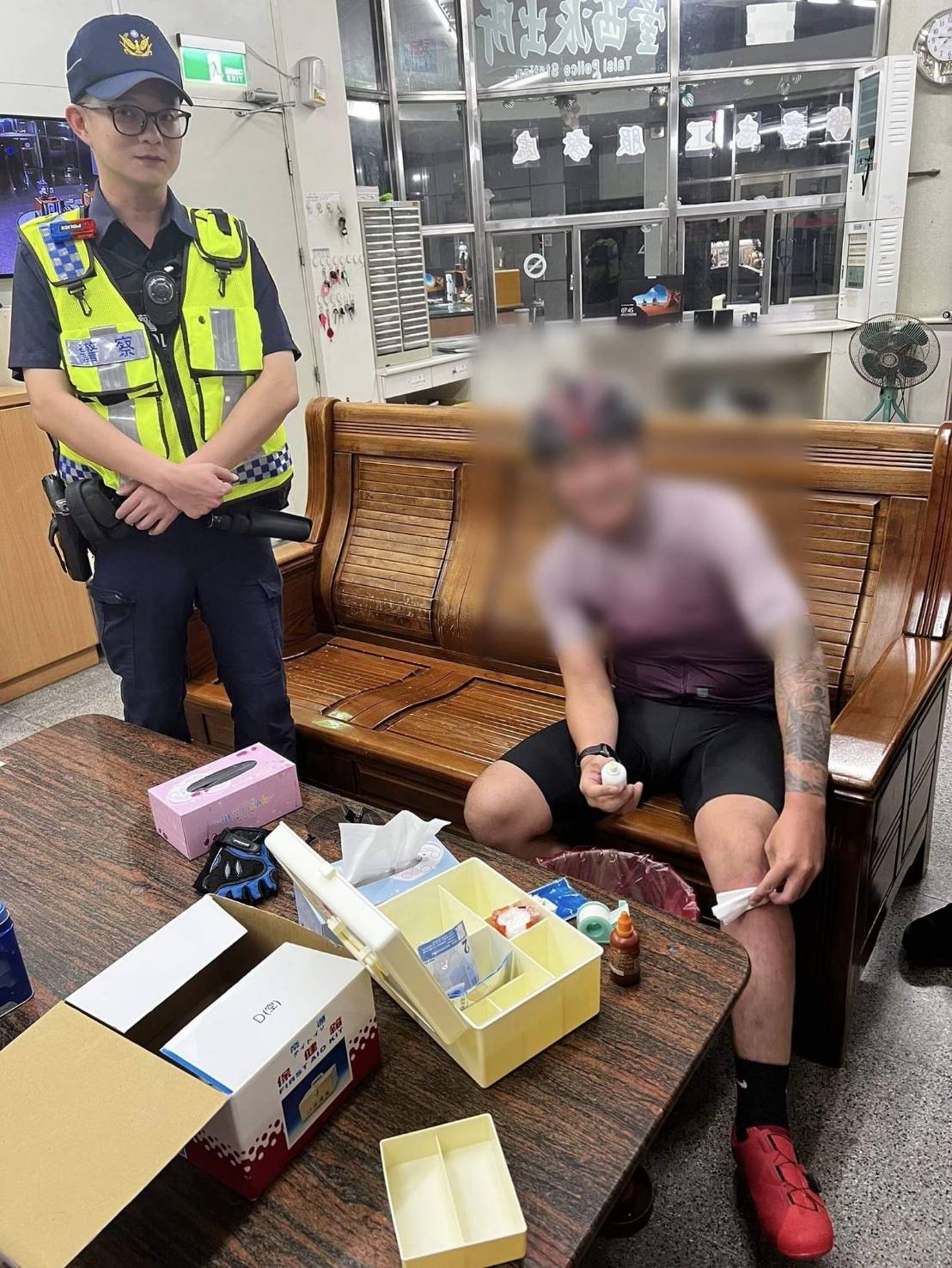 鐵馬騎士與朋友相約參加單車競賽,於日前19時從麥寮一路往南進行自主訓練,途中行經臺西鄉時不慎跌倒在地,巧遇執勤中的員警,臺西分局臺西派出所警員林郁軒、王明泉上前關心,請他至派出所內休息擦藥。
