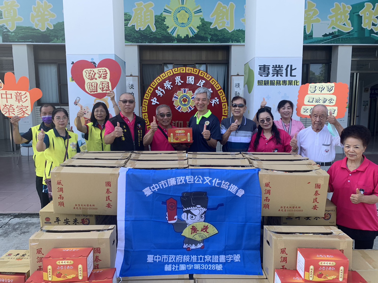 臺中市廉政包公文化協進會關懷中彰榮家長輩,近日特別至中彰榮家致贈物資一批,並提前祝賀榮民前輩們秋節愉快,由家主任呂德義率組室主管、長輩代表一同受贈,代表榮家長輩們表達謝意!