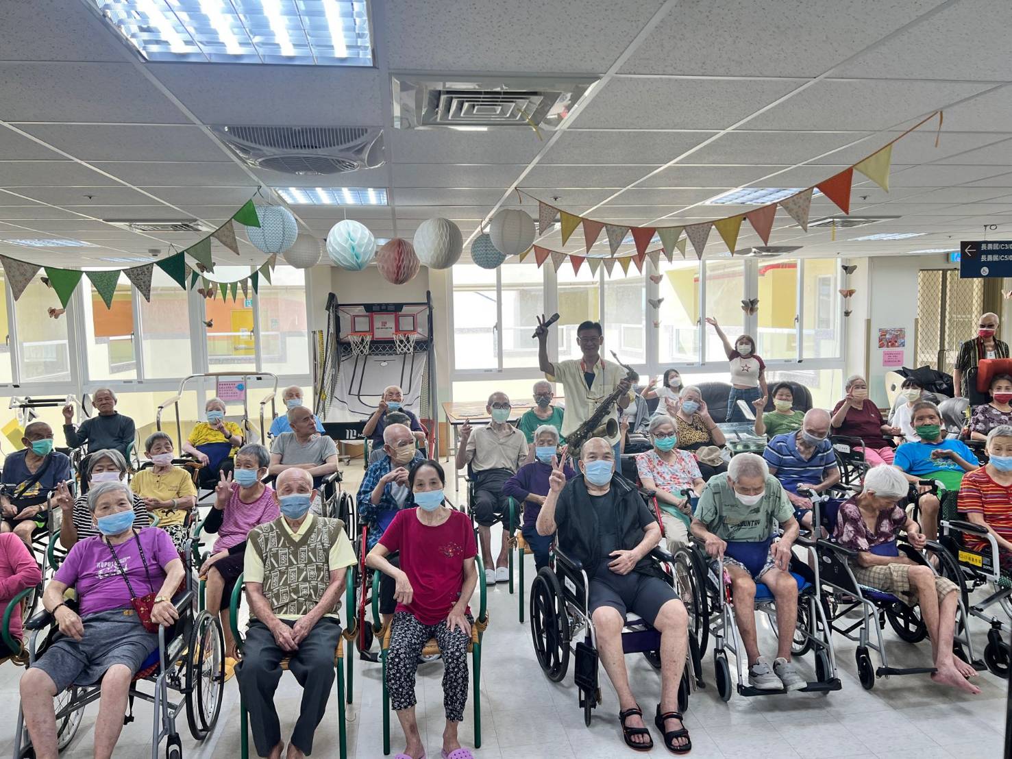 張處長吹奏的音樂響起,長輩聽到熟悉的曲目跟著一起歡唱,隨著樂曲聲擺動身體,藉由音樂活動,有助於維持長輩心理平靜,運用音樂相關的各種活動,使長輩與過往的生活經驗互相連結,維持內心健康。