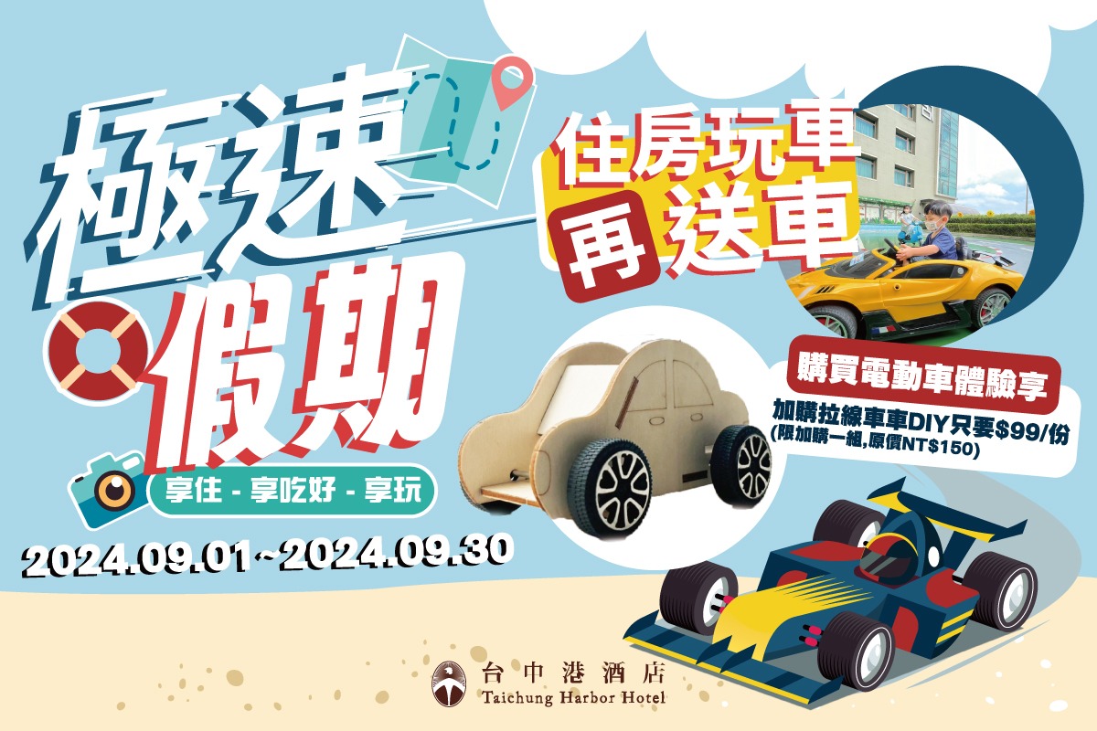 為了讓遊客能夠更加盡情體驗賽車氛圍,台中海線世界級景點高美濕地旁,台中港酒店推出「極速假期-住房優惠」活動。即日起至2024年9月30日,入住豪華家庭房的平均價格僅為每人 $1,650 元起。住宿套餐包括豐富的自助式百匯早餐、兩張電動車體驗券、以及DIY彩繪鷗嗨喲卡丁車體驗(價值 NT$199)。前30名訂房者更將獲贈「智高積木極速先鋒車」(價值 NT$699),入住期間免費使用酒店內的三溫暖和健身房設施。還可獲得台中港三井Outlet獨享禮遇兌換券,讓您的台中之行更添精彩。