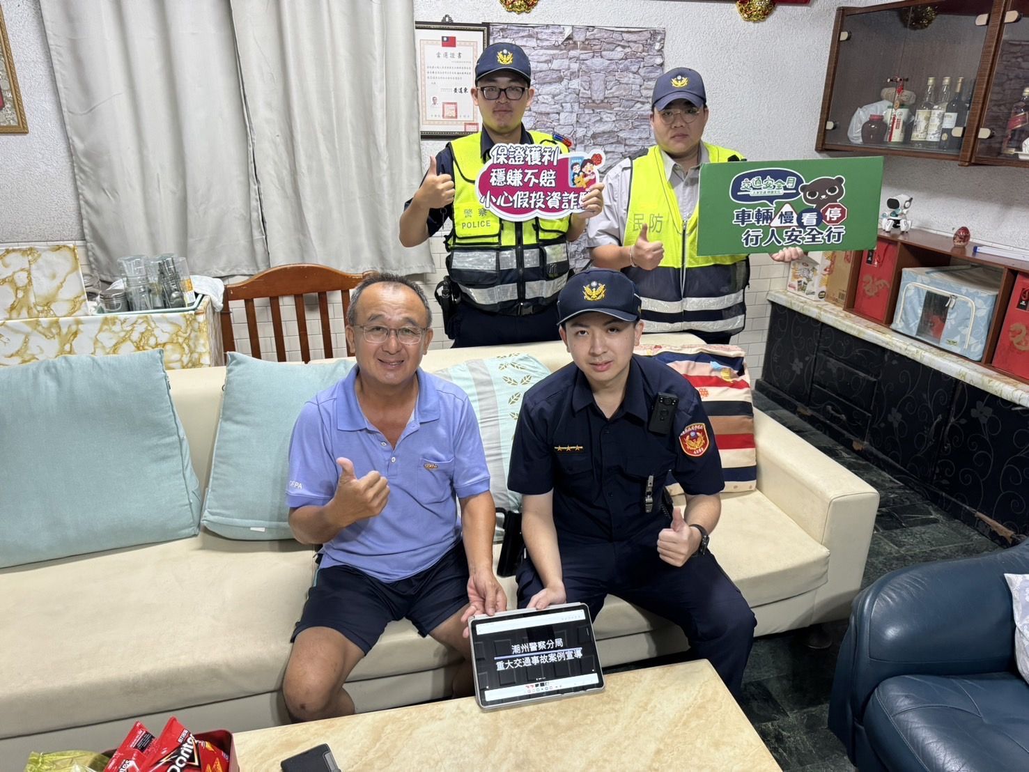 潮州分局因應政府推動制定及修正「詐欺犯罪危害防制條例」、「洗錢防制法」、「通訊保障及監察法」及「刑事訴訟法特殊強制處分專章(科技偵查法制化)」等打詐四法相關法案,為突破打詐困境,輔助政策執行,勤區員警以深入社區「入戶宣導」阻詐、識詐及交通安全,藉以深植民眾印象以達宣導效果。