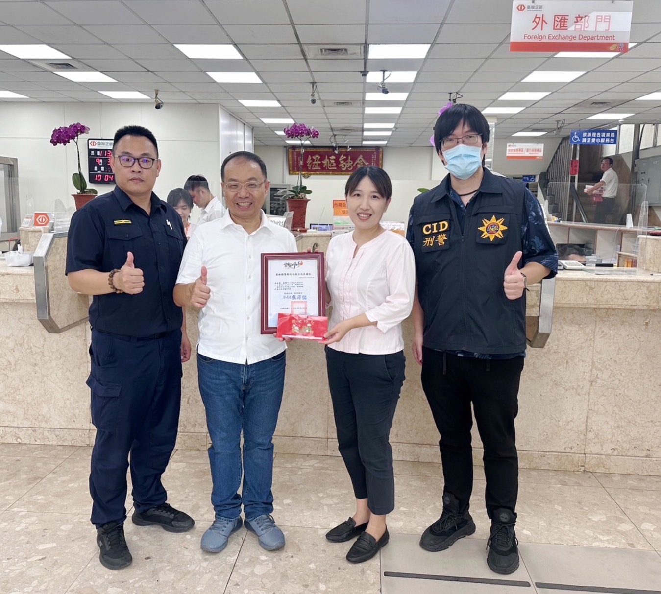 北港鎮陳姓婦人,因聽信詐騙集團說詞,前往臺灣中小企業銀行北港分行打算匯款,所幸蕭姓女行員例行性臨櫃關懷提問匯款用途,聽聞「投資虛擬貨幣」關鍵字,立即通知轄區北港派出所員警到場,成功保住陳婦的積蓄。北港警分局分局長張澤銘知悉上情,特地於今(3)日前往臺灣中小企銀頒發感謝狀及禮券致意。
