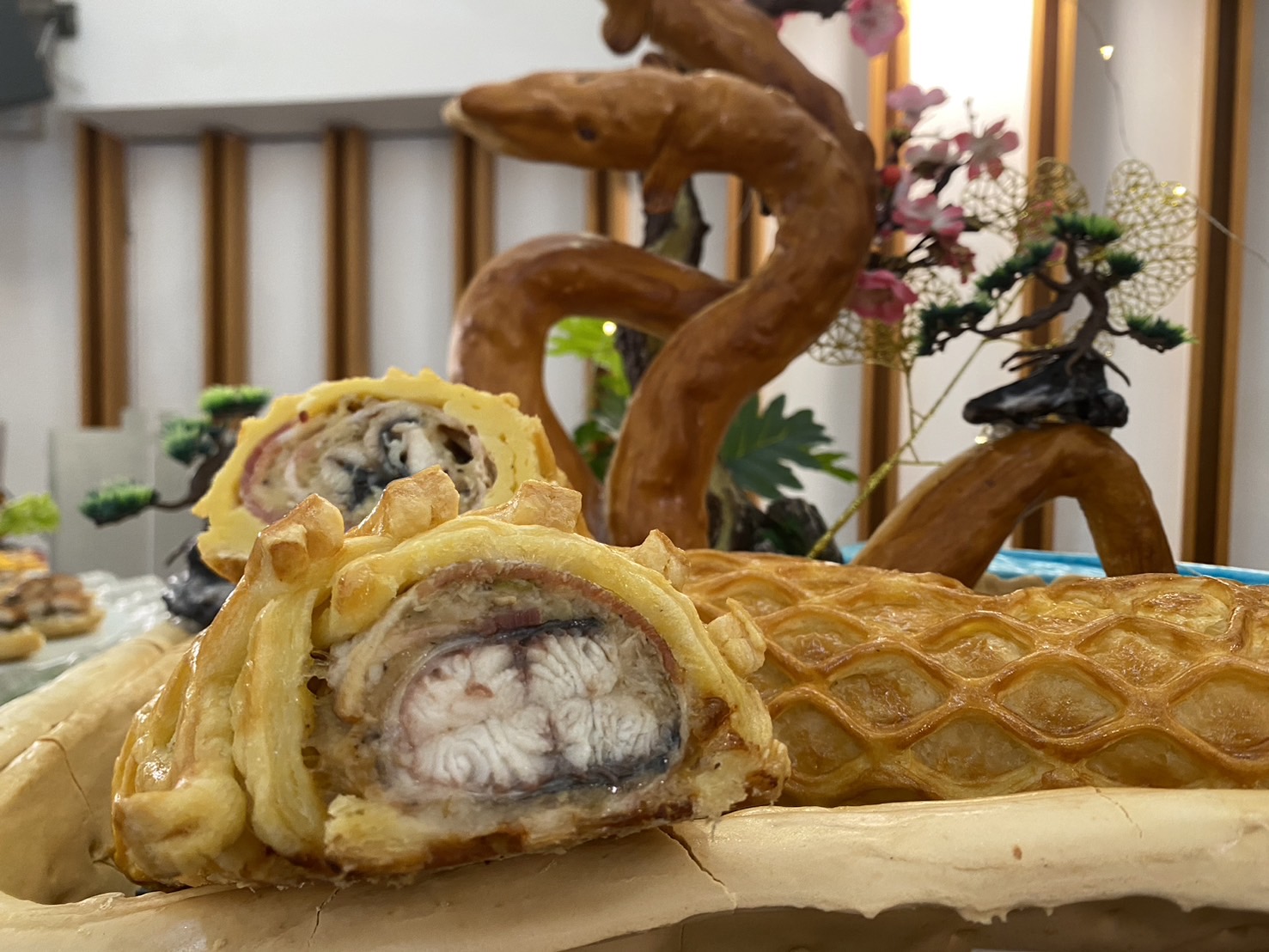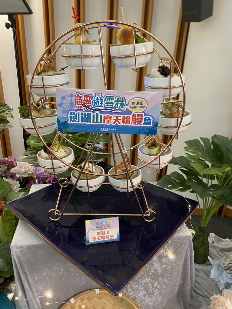 曾慶欑總經理表示,劍湖山渡假大飯店本次配合中秋節國慶煙火旅遊檔期,以實際行動採購國產鰻魚,推出具地方特色又與眾不同的美味鰻魚特色料理,迎接即將到來的各地旅客。由飯店禪園餐廳李鴻章主廚在記者會現場展示說明示範料理,現場特別邀請雲林劍湖山渡假大飯店禪園餐廳李鴻章主廚示範鰻魚特色料理,飯店在記者會現場展示說明示範料理,並由中、西餐料理團隊聯手推出包含蔗燻白鰻甜筒、江戶豆皮鰻魚、避風金沙筍鰻、綜合鰻魚串燒、鰻魚臘味煲仔飯、串燒烤鰻魚鮮食蔬、古坑咖啡燻烤鰻魚、威靈頓起酥鰻魚捲、烤鰻魚百花千層蛋及劍湖山摩天輪鰻魚等精緻鰻魚料理。讓民眾知道,外銷日本等級的國產白鰻,還有這麼多不同的料理手法,歡迎民眾來雲林古坑劍湖山渡假大飯店大飽口福。推薦民眾吃鰻免出國,在台灣即可享受外銷頂級的國產鰻魚,嚐到鰻滿健康和元氣的幸福滋味。