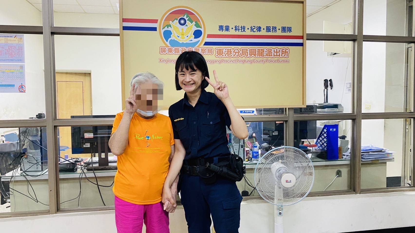 東港分局興龍派出所警員黃志煜、賴儒慧於日前傍晚巡邏時,獲報轄內安養中心有一84歲失智老婦外出失蹤,請求警方協助尋人,員警沿路調閱數十支路口監視器,終在兩公里外之產業道路尋獲徒步行走失智老婦,安養中心及老婦家屬對警方及時尋獲防止意外發生深表感謝。