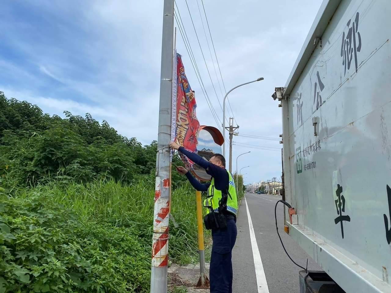 雲林縣警察局臺西分局為維護市場周邊道路及交通要道保持清潔暢通,持續執行整理清除道路障礙,除派員加強勸導外,並針對屢勸不聽違規攤販及車輛加強取締,以淨化道路空間,維護交通順暢,確保用路人權益,於日前上午針對轄內各要道、路段,對有占用道路堆放廣告旗幟、招牌、雜物等,實施清除工作,並請鄉公所清潔隊,協助配合執行取締、拆除、清除路障等工作。