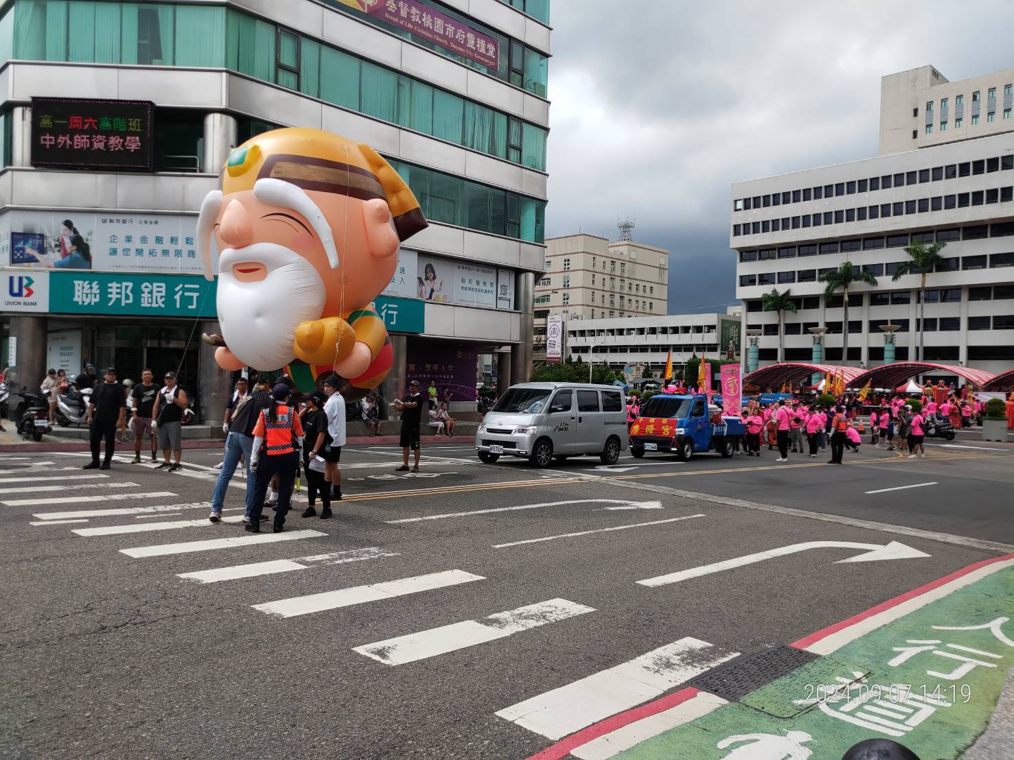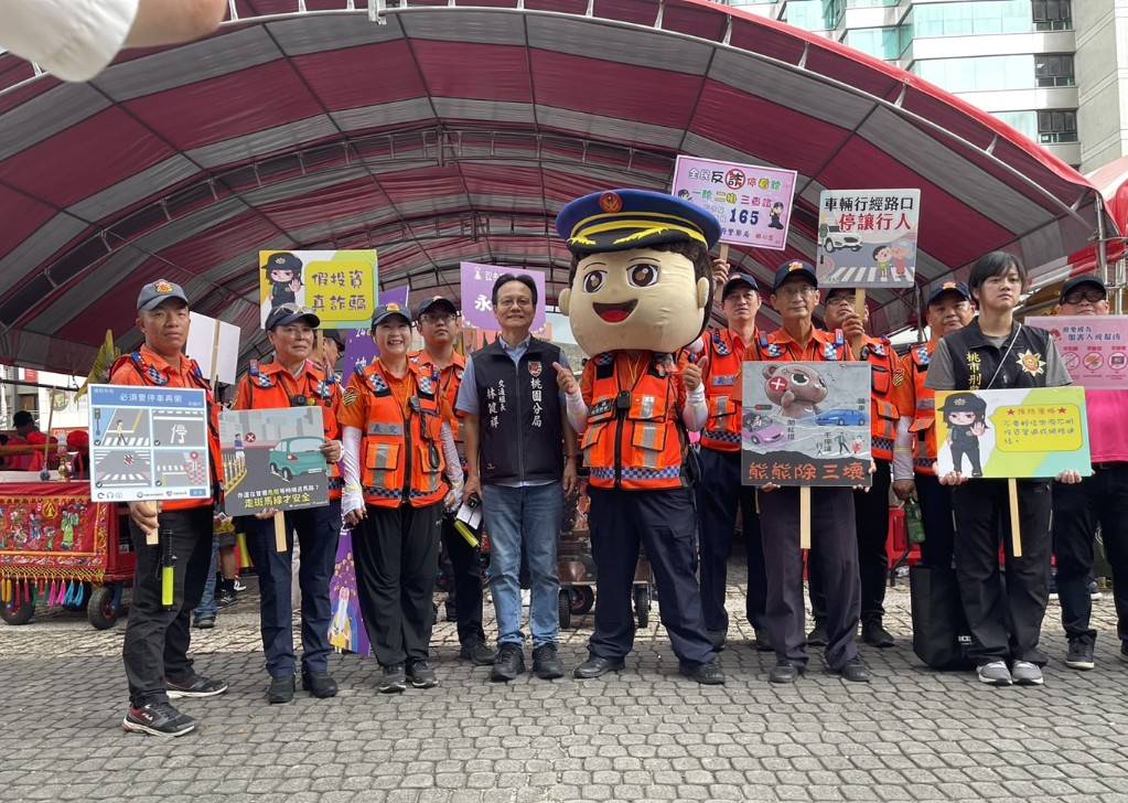 「2024土地公民俗藝術節」今(7)日熱鬧登場,參與團體13時先於桃園市政府前廣場集結,舉辦百神會師起駕儀式,14時起依序出發繞行桃園區道路,稍晚在新永和市場旁停車場舉辦主獻大典,桃園警察分局除投入警力、義交人員針對活動周邊路段進行交通疏導管制,藉此活動進行「交通安全月、婦幼安全、反詐騙」等宣導,深化交通安全、婦幼安全及反詐騙意識,分局長蔡啟仁特別呼籲民眾,一同響應「婦幼安全」、「反詐騙」、「人本交通 停讓文化」與「車輛慢看停 行人安全行」等交通安全月的主題與口號,藉此深化犯罪預防及交通安全意識。