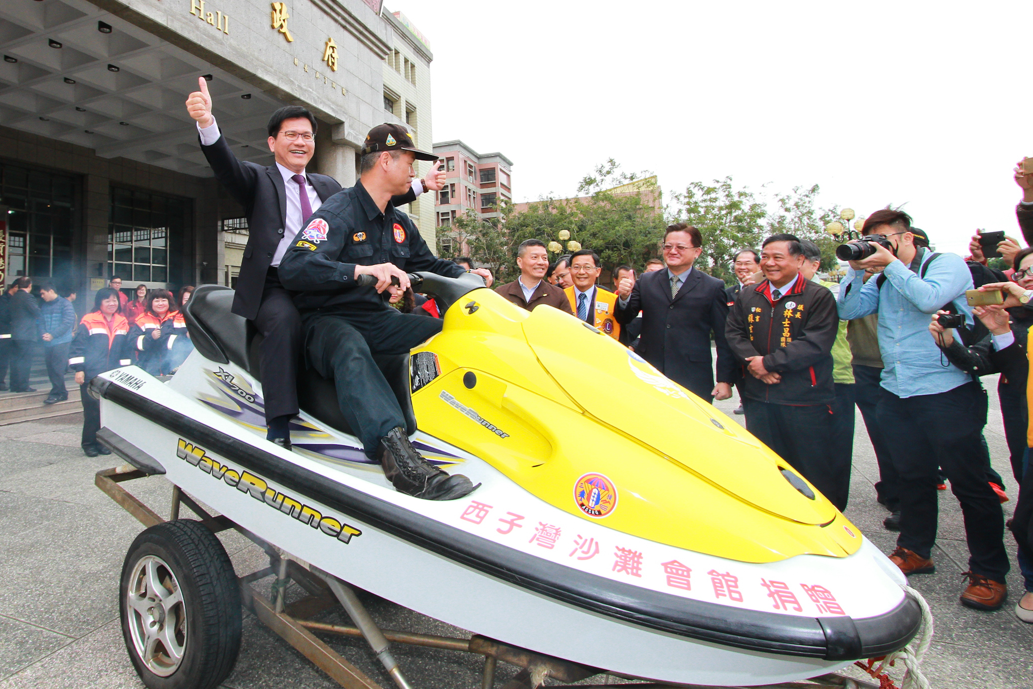 對於台中市消防人員在水域搜救案件中的奉獻,西子灣沙灘會館相當肯定,在得知消防總隊三棲特搜分隊有水域救援裝備需求,特地捐贈三輛水上摩托車,市長林佳龍感謝該公司慷慨解囊,盼為水域救援注入更多能量,嘉惠市民。