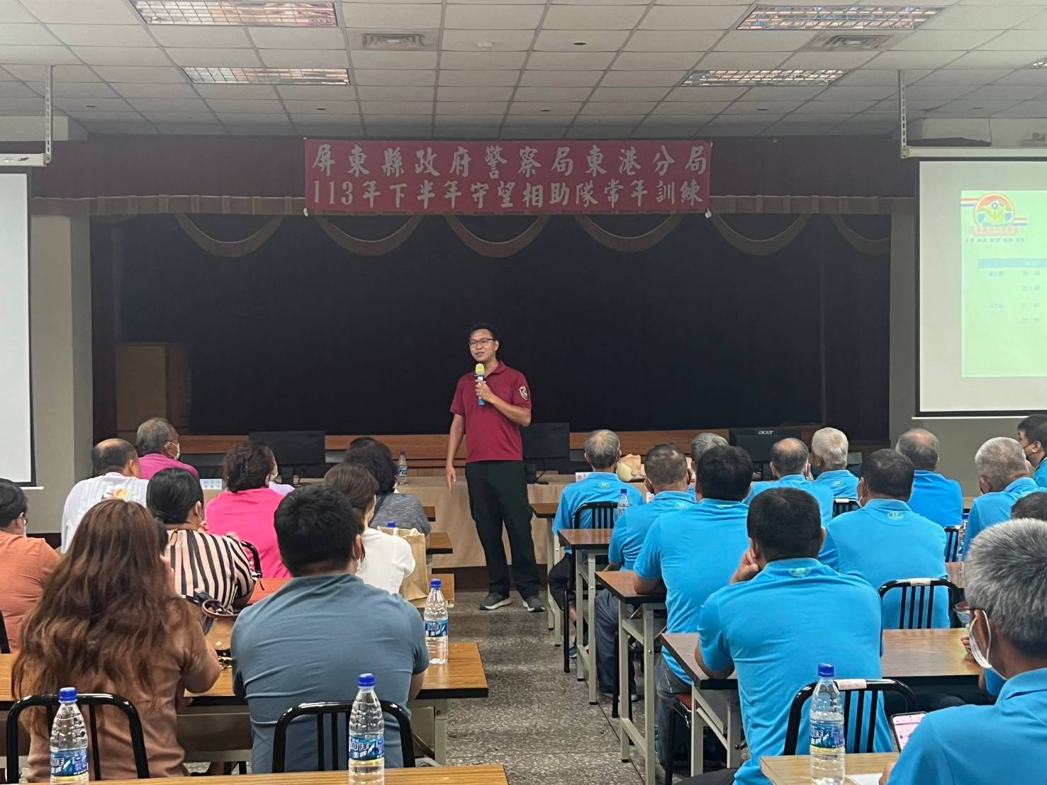 東港警察分局為強化守望相助隊員平時執勤技巧及法治觀念等,特於113年9月19日在分局5樓禮堂,召集轄內東港鎮下廍、東津、林邊鄉鎮安、崁頂鄉南望安及新園鄉瓦磘等共5個社區守望相助隊幹部及隊員計121人,辦理常年訓練,各隊均穿著所屬隊服,精神飽滿參訓,會中宣導巡守勤務執勤要領及注意事項、家庭暴力案件通報、警察運用技能、巡守勤務執勤要領及交通安全知識等宣導。本分局特別邀請東港消防分隊利用此次常訓機會,教導災害預防搶救通報、心肺復甦術操作及AED儀器使用方法並實際演練,籲請守望相助隊成員於村里巡守時,向社區民眾及村里親友進行教導。