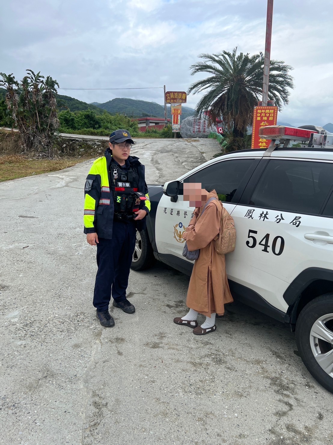 警方見狀上前關心,得知該長者從鳳林鎮長橋里搭乘公車前往廟中參拜,但因對當地地理環境不熟悉,錯過公車班次而無法順利返家,當時天候不佳,風勢強且時飄陣雨,為確保長者安全,員警不辭辛勞,將長者載至分駐所旁能避風雨之公車站,並耐心叮囑他相關乘車資訊,長者在員警的協助下,順利搭車返家。