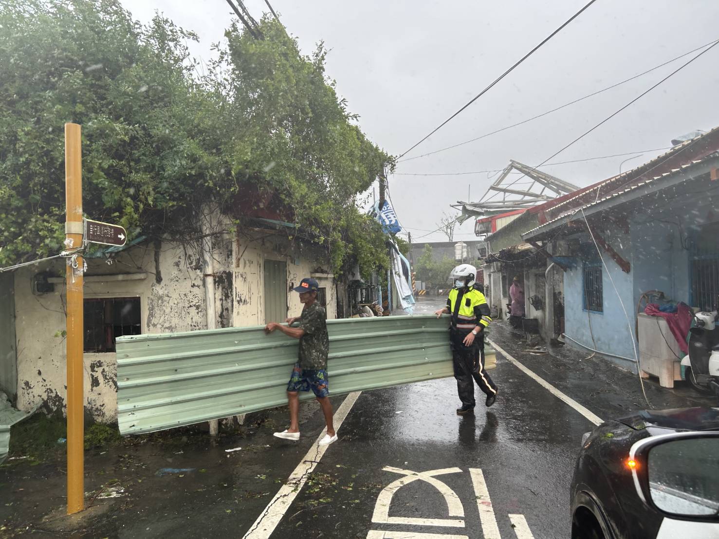 東港警分局林邊分駐所所長李毅信、警員張汝婷於本月3日10時許執行巡邏勤務,接獲報案稱於林邊鄉中山路二巷有多片鐵皮掉落,且有廣告鐵架遭吹翻砸到民宅,請求警方到場協助。