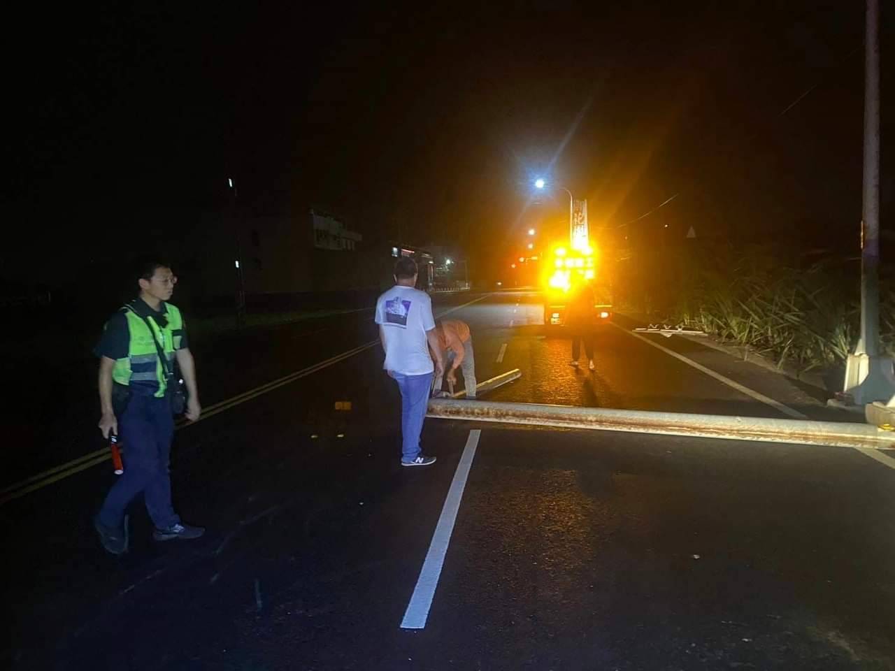 日前19時許,臺西分局東勢分駐所接獲民眾報案表示,在東勢鄉往臺西鄉加油站路口道路指示牌掉落,影響交通請求警方處理,巡佐李建邦、警員潘建嘉獲報立即前往。