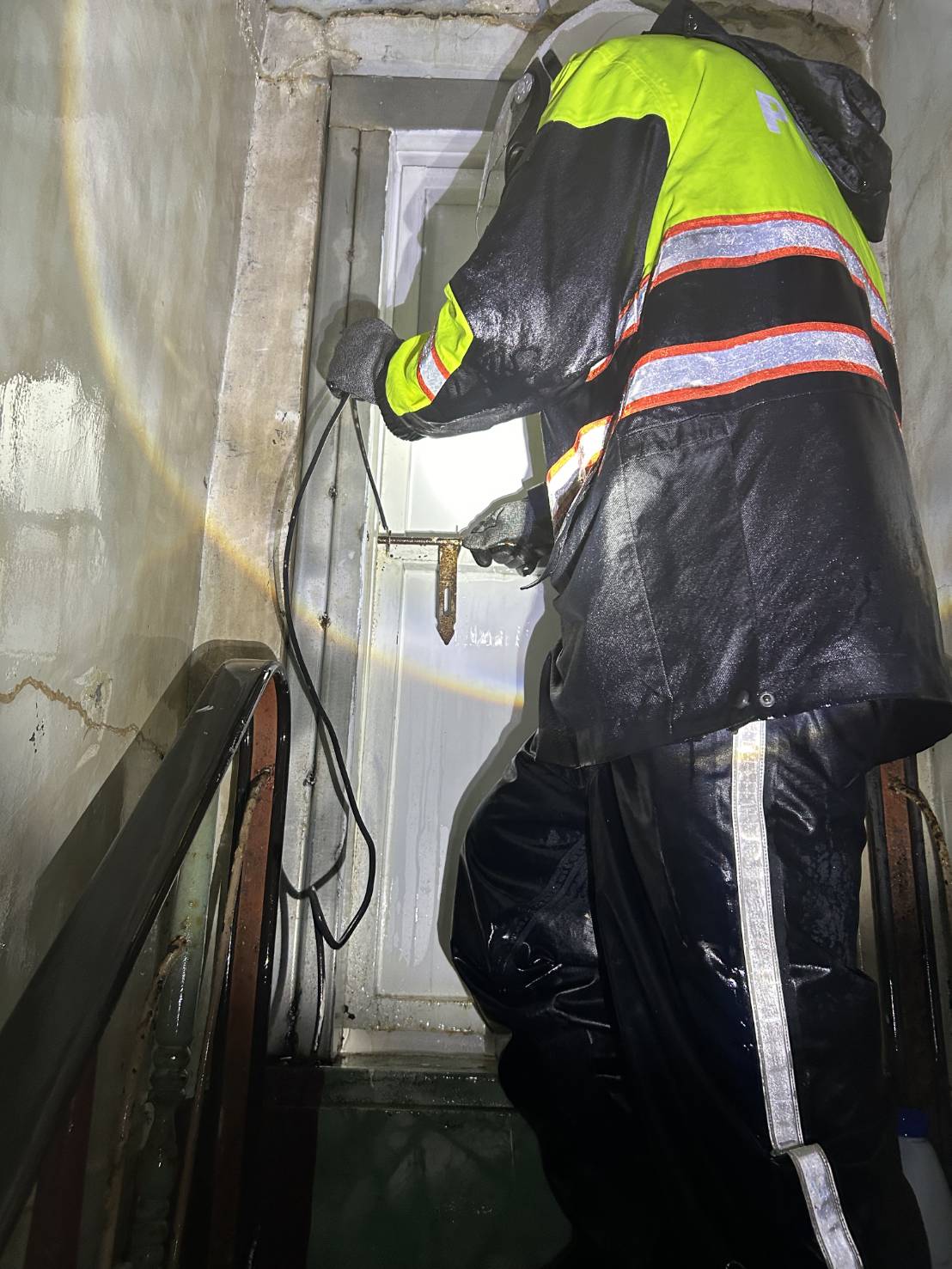 因逢大風大雨,警方至現場了解狀況後發現,原來該戶陳姓女屋主為一人獨居,其住家三樓之鐵門遭強風吹開,導致雨水灌進屋內造成樓梯間漏水,因屋主之前手部受傷無法將鐵門關上,故報警請求協助;警方至三樓將鐵門拉上,並以繩子加以繫牢、固定,以免鐵門再次遭吹開,陳姓女屋主對東港警的協助表示由衷感謝。