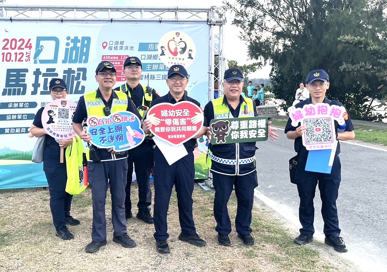 「2024口湖馬拉松」12日清晨於宜梧滯洪池開跑,吸引全國上千位熱愛跑步的選手參加,透過馬拉松賽事將有「雲林日月潭」之稱的宜梧滯洪池美景介紹給更多人;北港警分局除了執行本次馬拉松活動的交通疏導及秩序安維勤務外,也到場進行識詐、反詐及婦幼、交通安全宣導,現場與民眾一同強化識詐、防詐,加深民眾正確預防觀念,避免陷入詐騙集團陷阱,降低受騙機會。