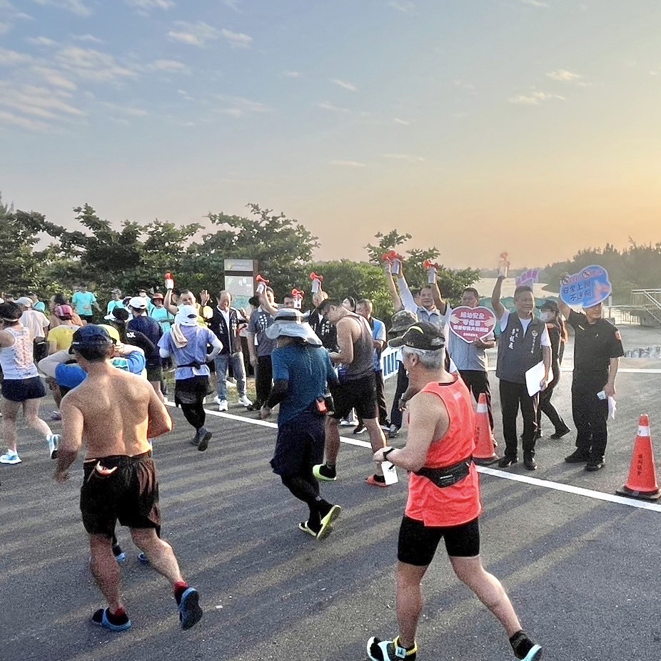 北港警分局除協助賽事交管、維護交通秩序及保護人車安全,天還沒亮,副分局長何漢釗即率領預防犯罪宣導團在現場設攤,透過快問快答互動遊戲,讓民眾更熟悉各類詐騙的特徵及關鍵字。
