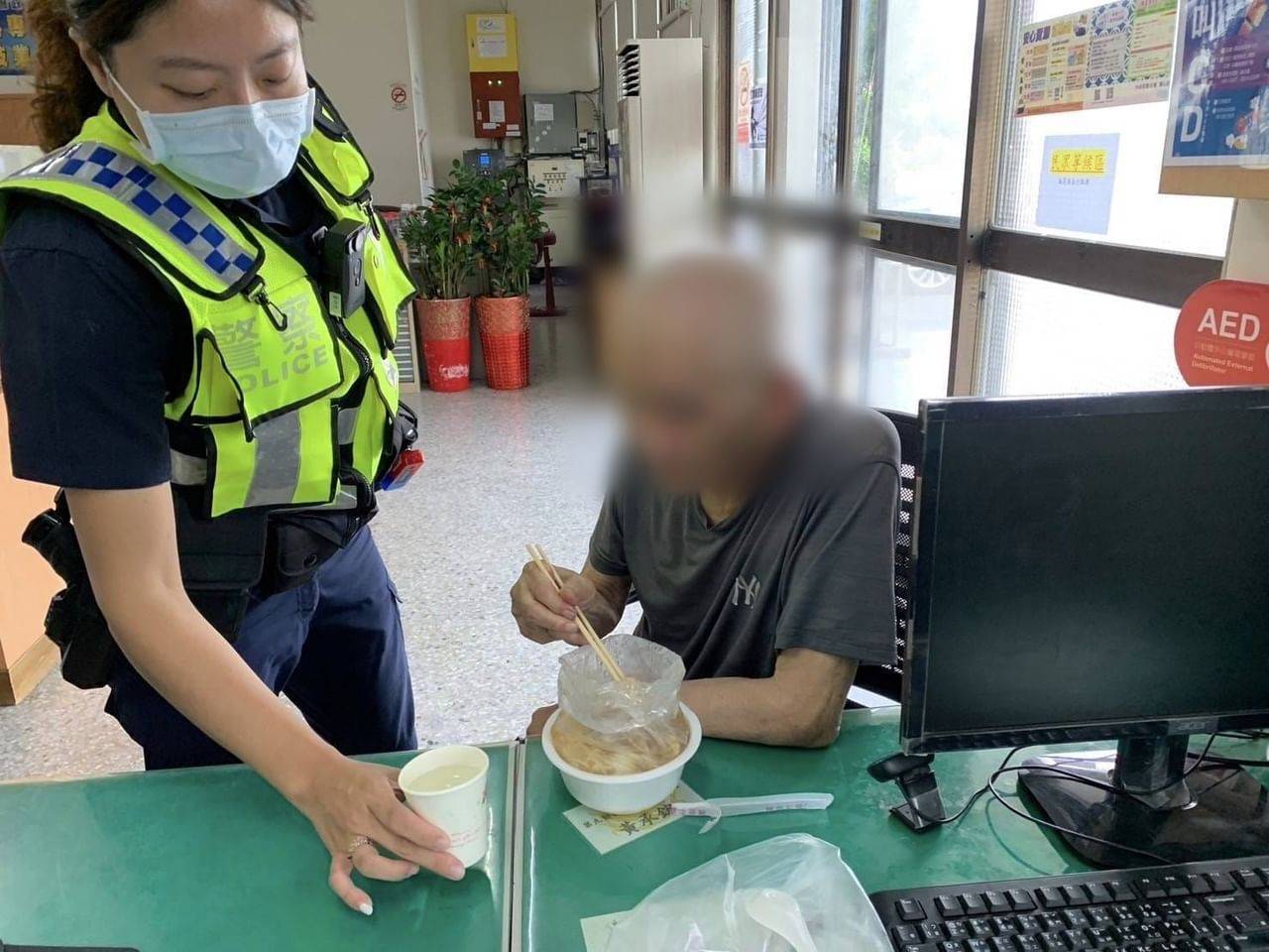 警方查詢相關資料,發現老翁最後一次出現地點是在北港鎮,有可能往四湖方向前進,四湖分駐所警員林瑞銘、黃伊君立即在轄區展開搜尋,於10時許在四湖鄉中正路發現一名老翁,他打著赤腳撐著雨傘獨自行走,步履蹣跚,警方立即上前關心:「阿伯!你住哪裡?怎麼沒有穿鞋子?」對於警方的提問他皆低頭不語,為了安全警方載他回所內安置,員警端上飲用水買來熱湯麵讓他充飢,老翁飢腸轆轆的大快朵頤。