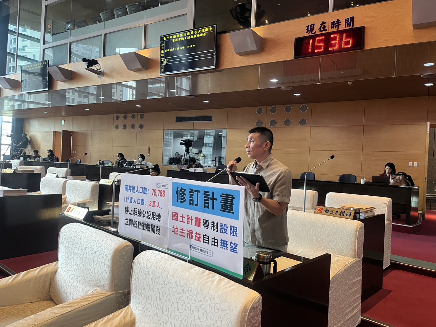 台中市議員林孟令在本次定期會財經委員會業務質詢時,對國土計劃開宗明義講:政府現在頒布國土計劃,引起地主憂心忡忡,建議台中市政府對於國土計劃,應該要辦理修訂或有配套措施。