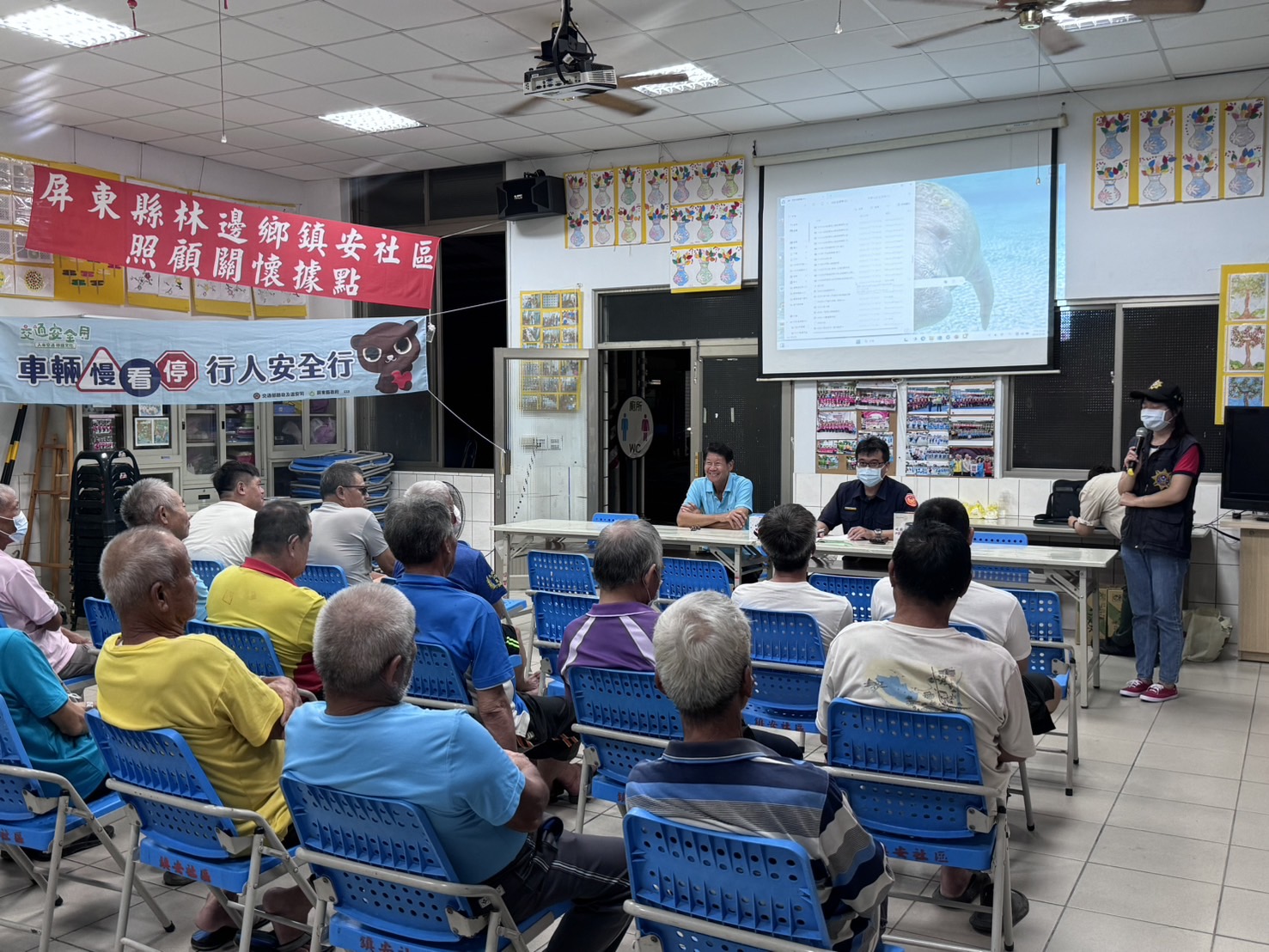 東港警分局第三組組長日前率分局第三組、第五組、偵查隊、東港派出所及林邊分駐所等人至東港鎮下廍里及林邊鄉鎮安村等社區發展協會舉辦社區治安會議,向民眾們進行識詐、反詐觀念,避免陷入詐騙集團陷阱及宣導婦幼、交通安全觀念。